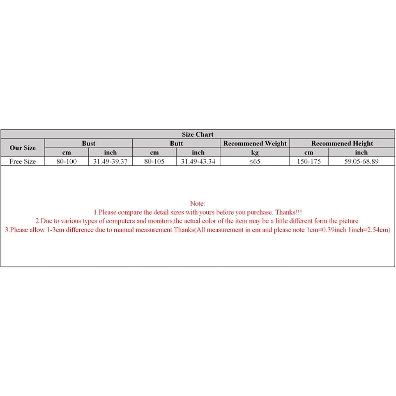 Свободный размер: обхват груди: 80-100 см/31,49-39,37 дюйма стык: 80-105 см/31,49-43,34 дюйма Высота: 150-175 см/59,05-68,89 дюйма подходящий размер: рекомендуемый S-XL: ≤ 65 кг
