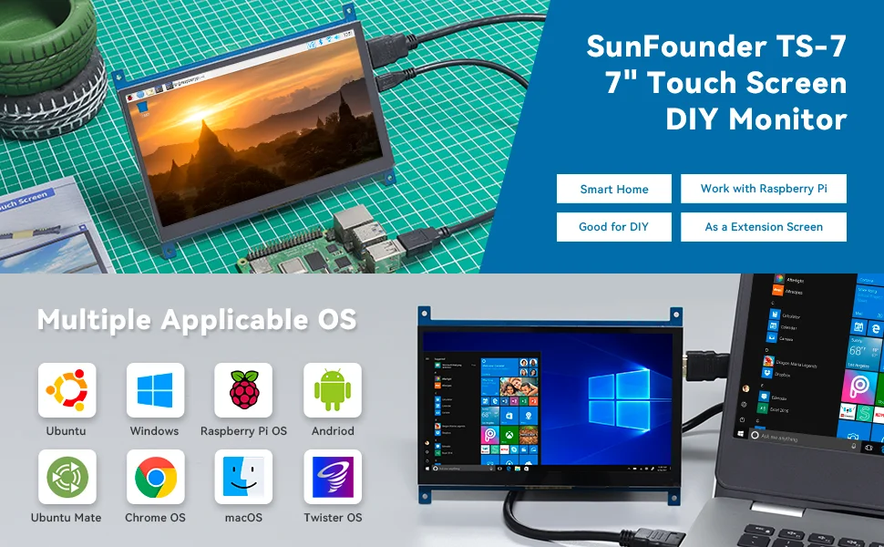 SunFounder 7 "IPS монитор является 5-точечный емкостный сенсорный экран с разрешением 1024x600 и высокого качества IPS панель, которая подарит вам идеальный визуальный опыт.