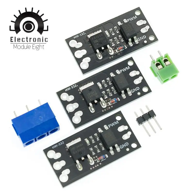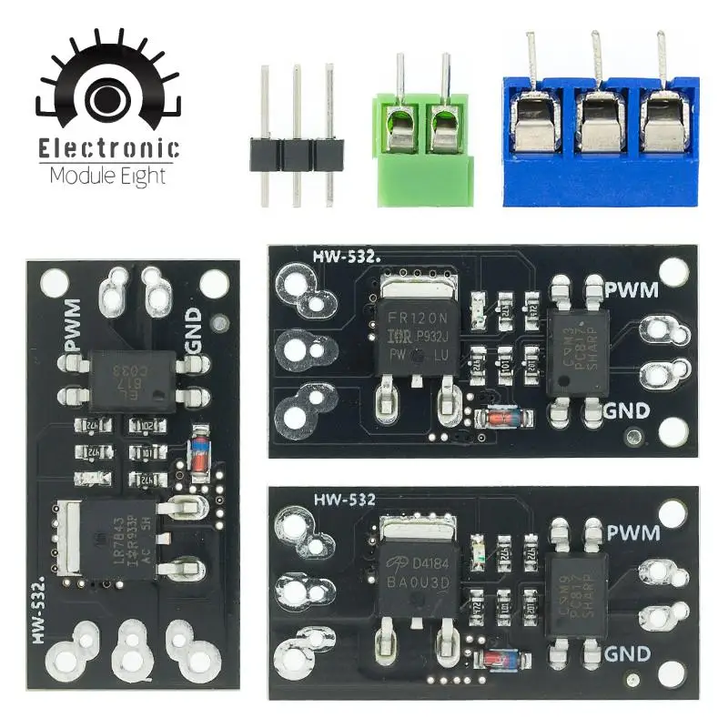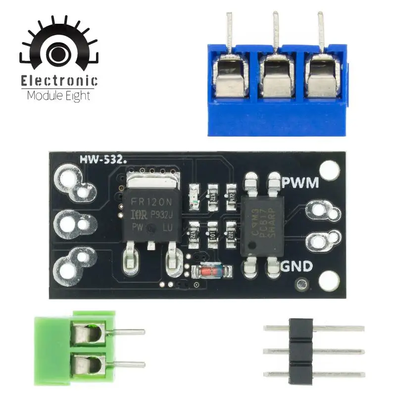 Характеристики модуля: 1. С Изоляцией оптопары, управляющий сигнал и мощность управляемого устройства изолированы, что значительно увеличивает жесткость помех. 2. Совместимость с микроконтроллером (MCU) и панели управления Arduino, 3V или 5V сигнала 3. Высокий уровень старт, низкий уровень стоп, PWM регулирование скорости 4. Широко используется для управления запуском и остановкой двигателя, электромагнитного клапана и другого оборудования 5. Есть различные спецификации MOS tube, чтобы обеспечить выбор, E.g: FR120N : 100V 9.4A LR7843 : 30V 161A AOD4184: 40V 50A 6. Сигнальная Входная сторона может быть приварена к терминалу или самому штифту, Совместимый макет 7. Выход может быть припаян к клемме или прямой проволоке 8. Размер модуля 23 мм X 16 мм есть два отверстия 2 шуруп диаметром мм, расстояние между отверстиями 8 мм