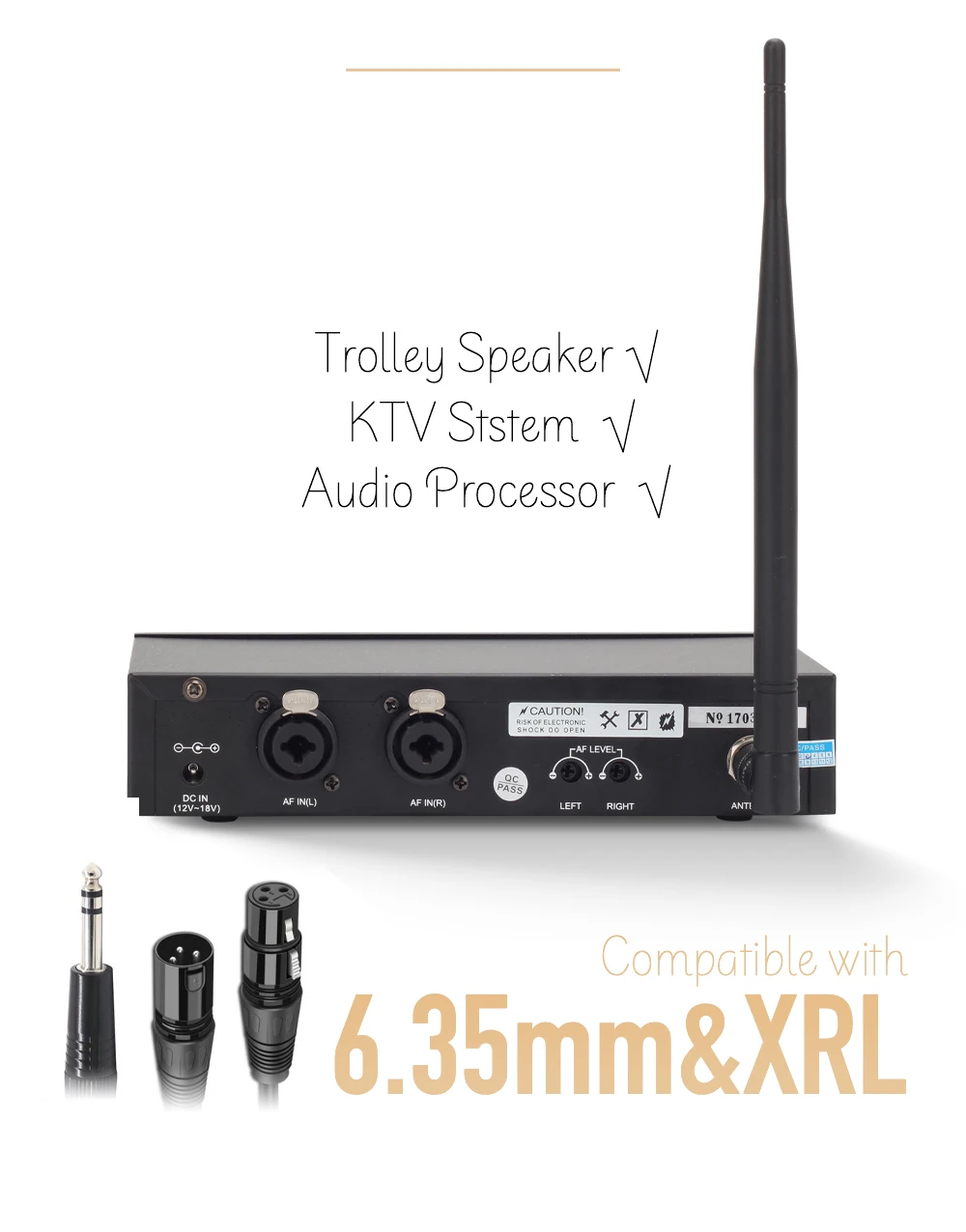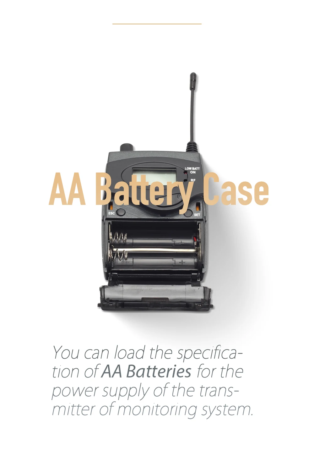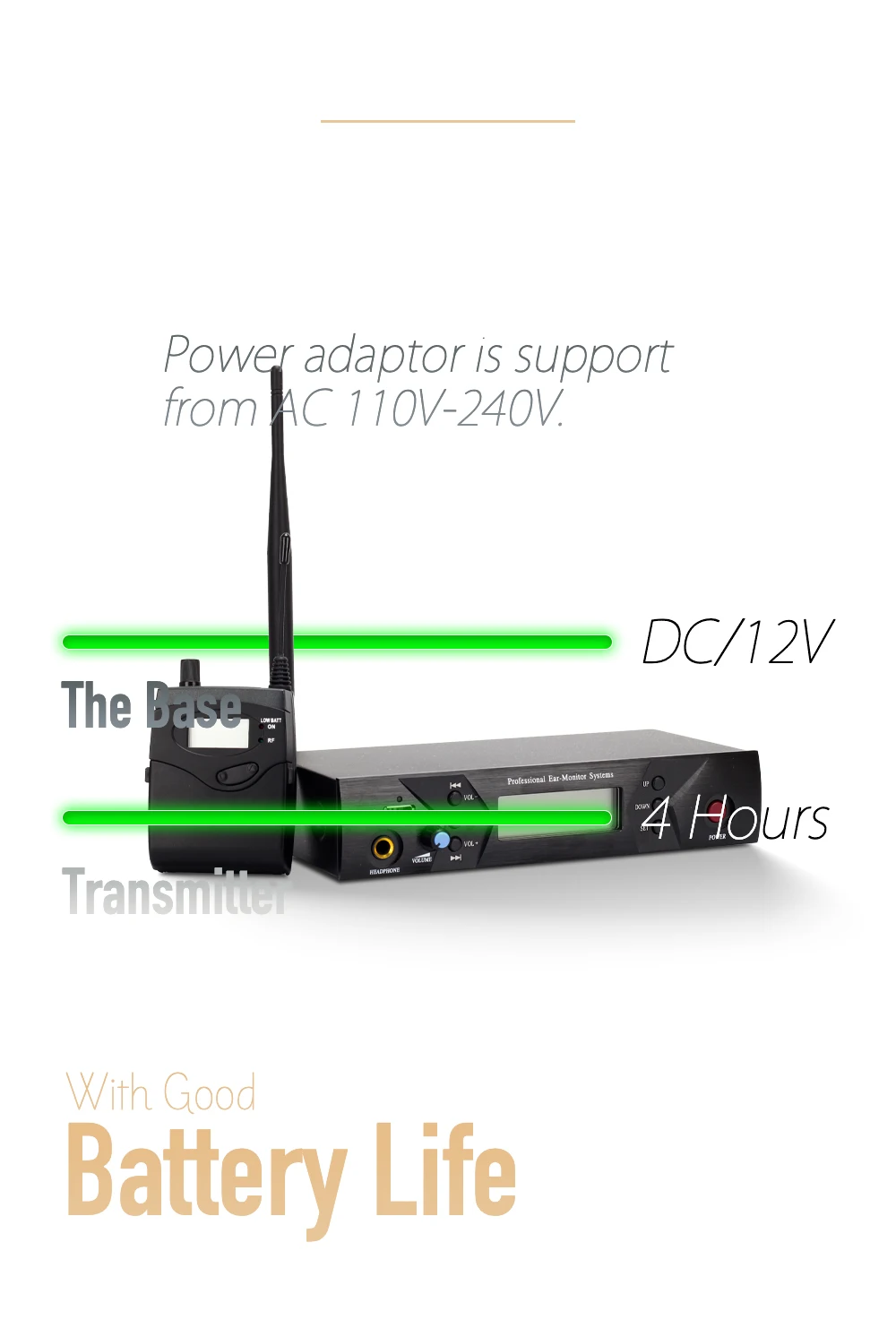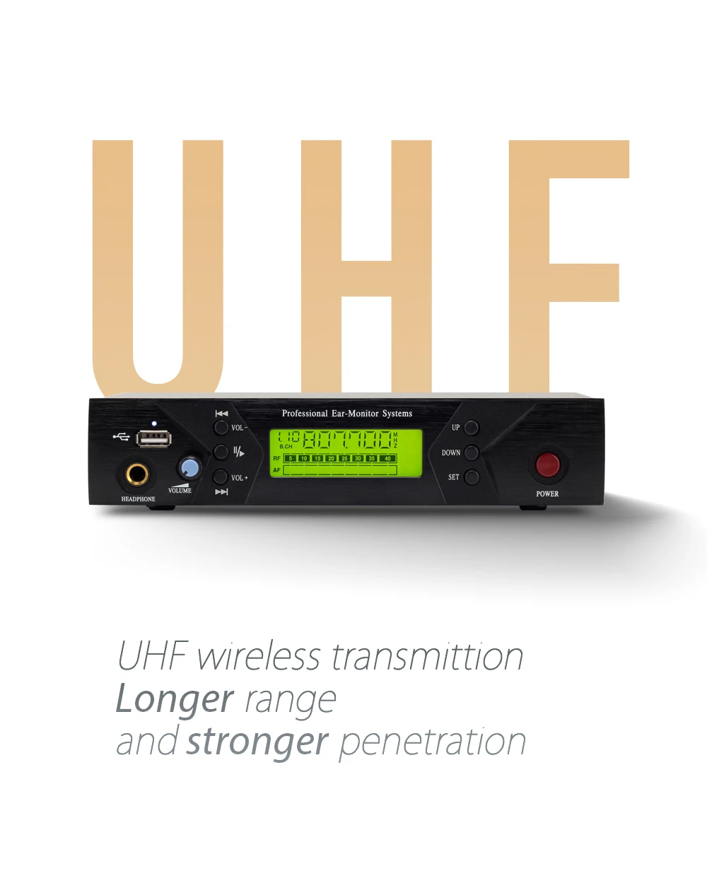 Беспроводная Производительность:Эта система UHF stereowireless in ear monitor работает в диапазоне 800 МГц (789 МГц-830 МГц), без помех, используя UHF широкую передачу аудио сигнала (до 89 систем могут работать одновременно). Беспроводная система позволяет пользователям свободно перемещаться на сцене и в студии с рабочим расстоянием от 100 м в открытом пространстве, линии видимости. Для большего расстояния, Пожалуйста, избегайте толстых стен, стекла и металлического блока.