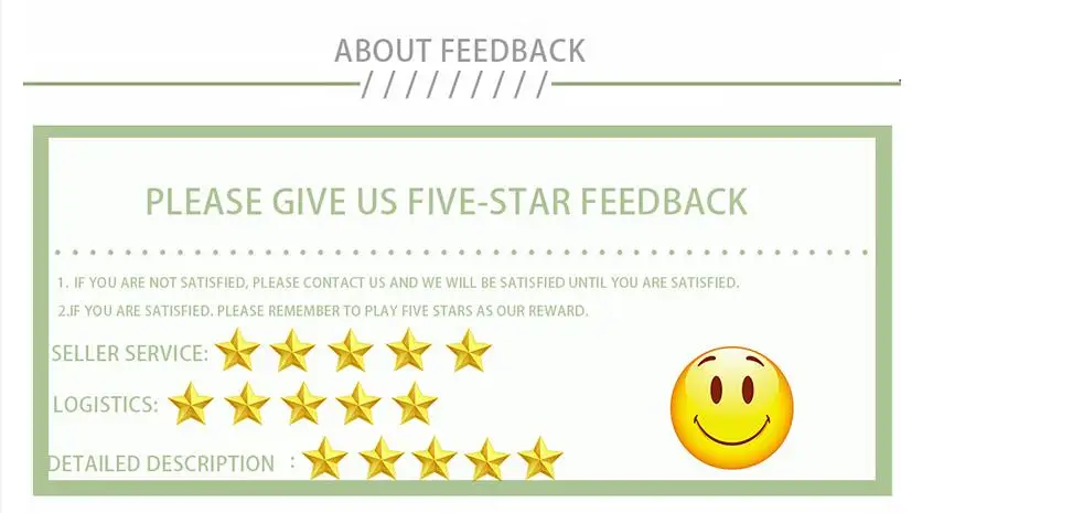 Ваши отзывы очень важны для нас. Если вы довольны нами, пожалуйста, не забудьте оставить нам положительные отзывы (5 звезд). Если у вас есть недовольство, пожалуйста, дайте нам возможность решить проблему, прежде чем оставить нам отрицательный отзывы. Ваше удовлетворение преследует нашу цель.