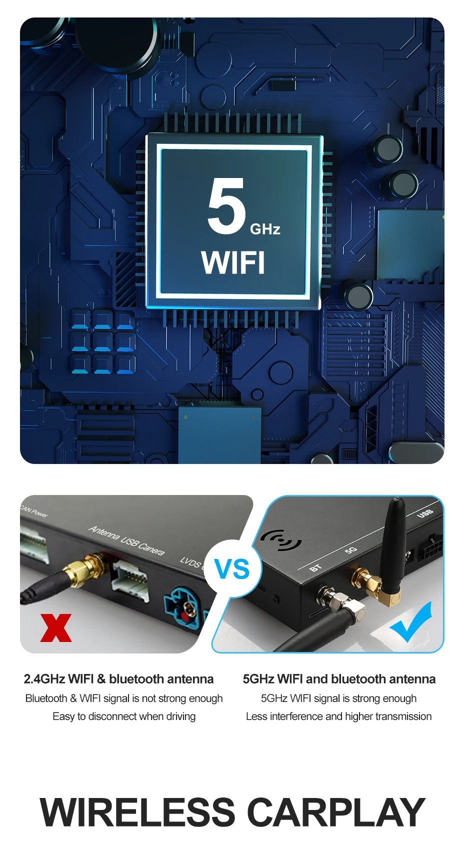 > С технологией сети Wi-Fi 5 ГГц, будет иметь более стабильное соединение и более низкую задержку во время вождения. Подключите напрямую WIFI и bluetooth от iphone к модулю Carplay.