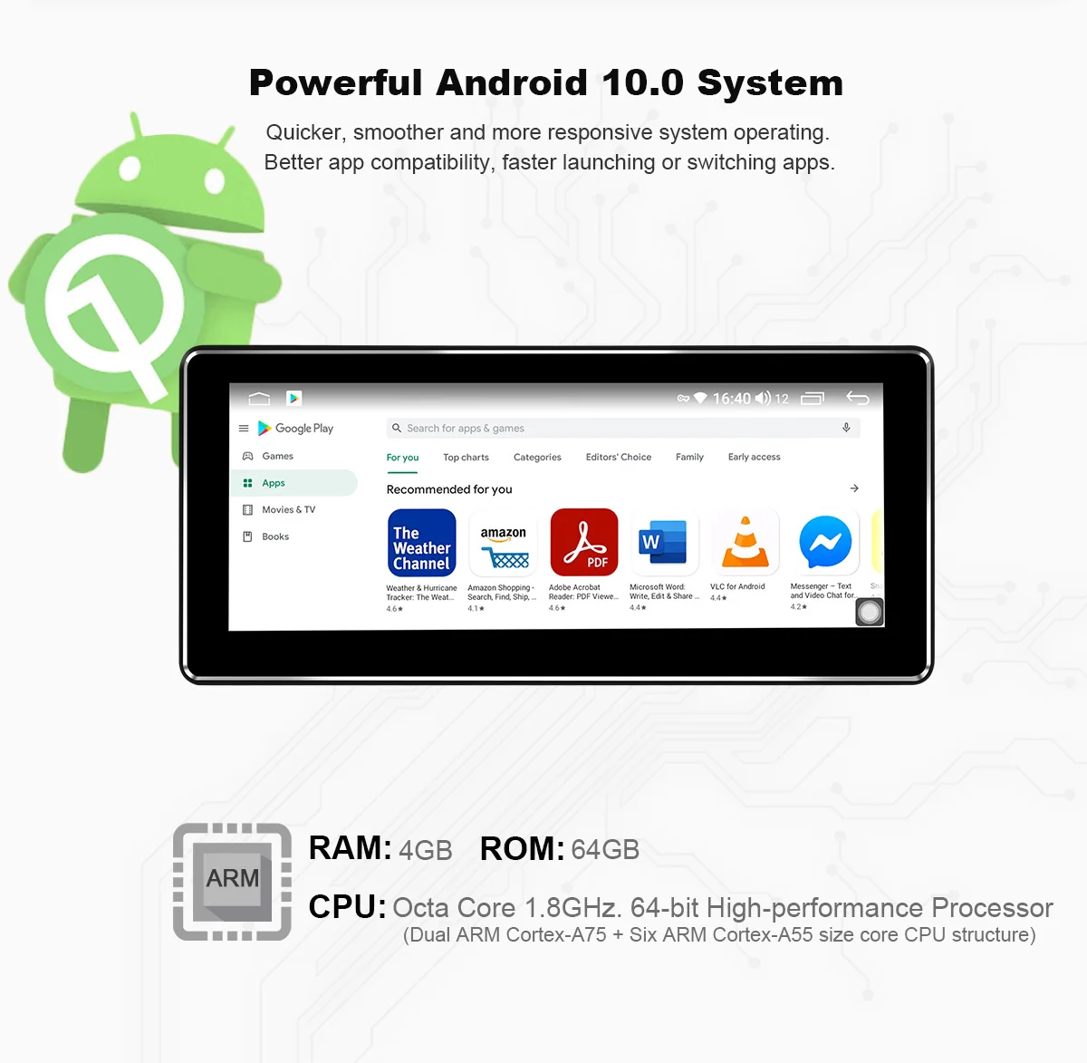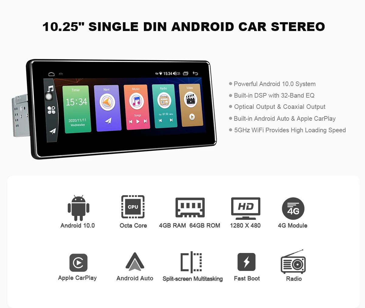 1. Совместимость с Android 10,0, UIS7862 восьми-ядерный 1,8 ГГц двухъядерный процессор ARM Mali G52 614,4 МГц 10,25 дюймов 1280*480 IPS HD Экран
