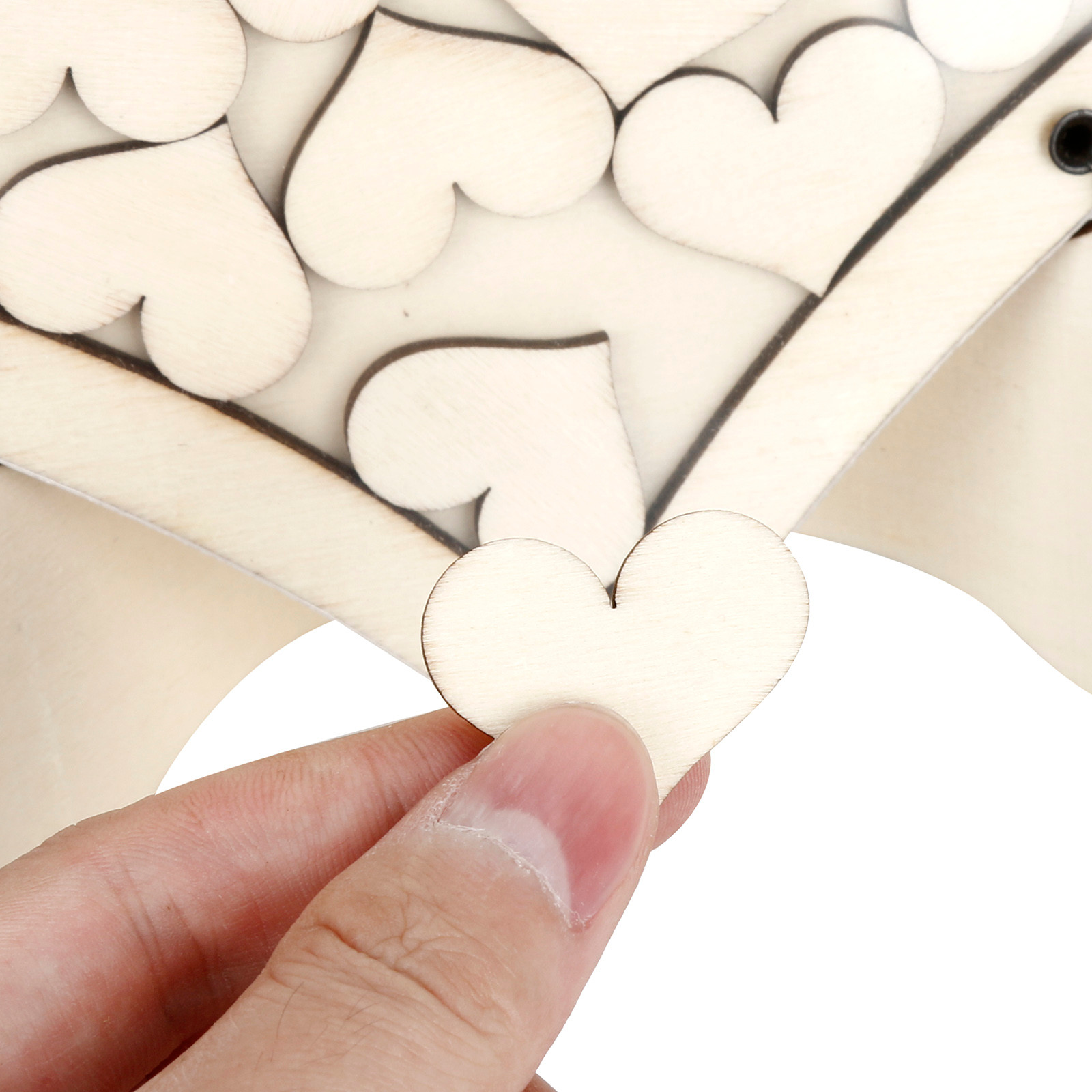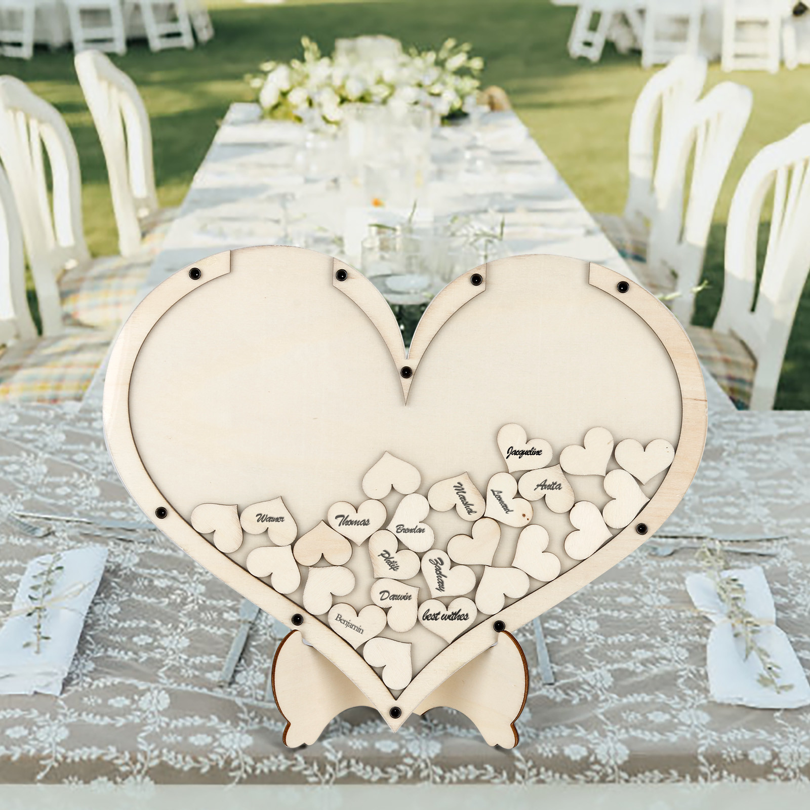 Уникальный стиль деревянных сердец, где ваши гости могут написать свои имена и пожелания и упасть на раму.