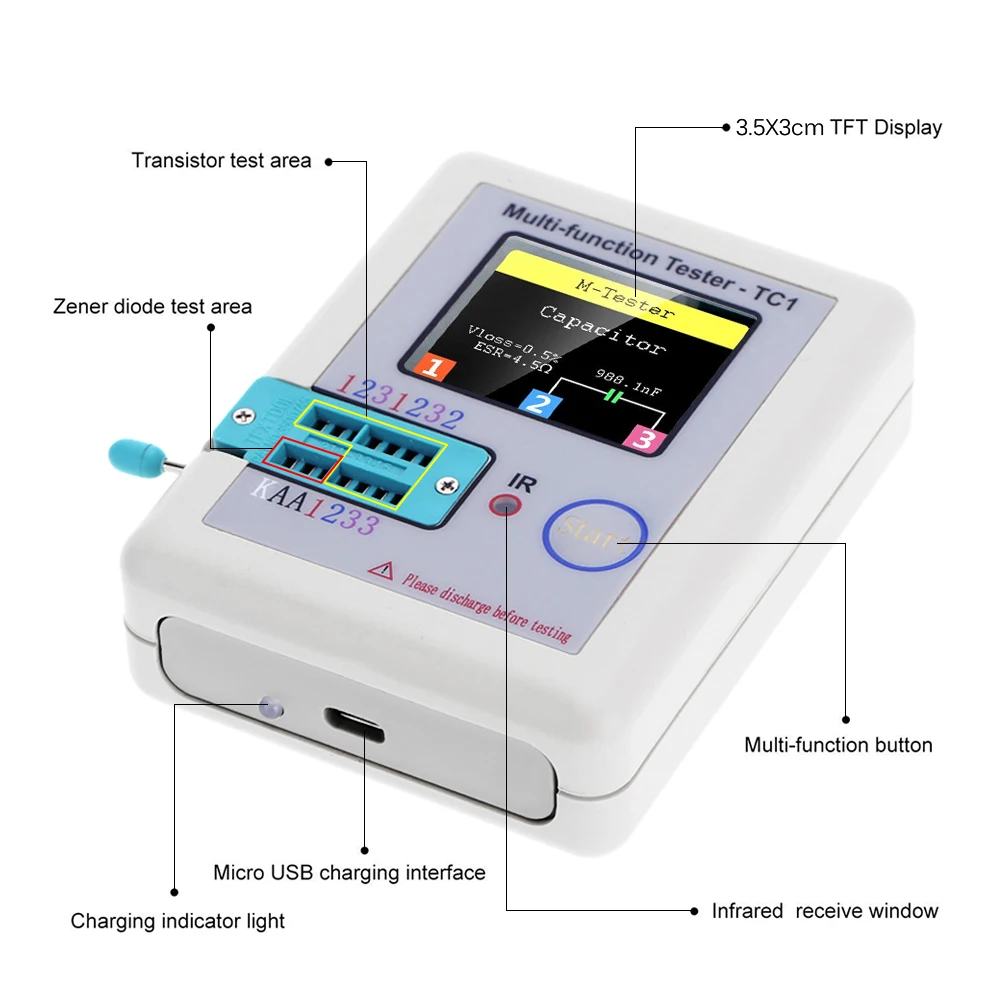 Его можно широко использовать для обнаружения NPN и PNP транзисторов, конденсаторов, резисторов, диодов, триодов, n-канальных и p-канальных МОП-транзисторов, IGBT, JFET, ТРИАКОВ и аккумуляторов и т. д.