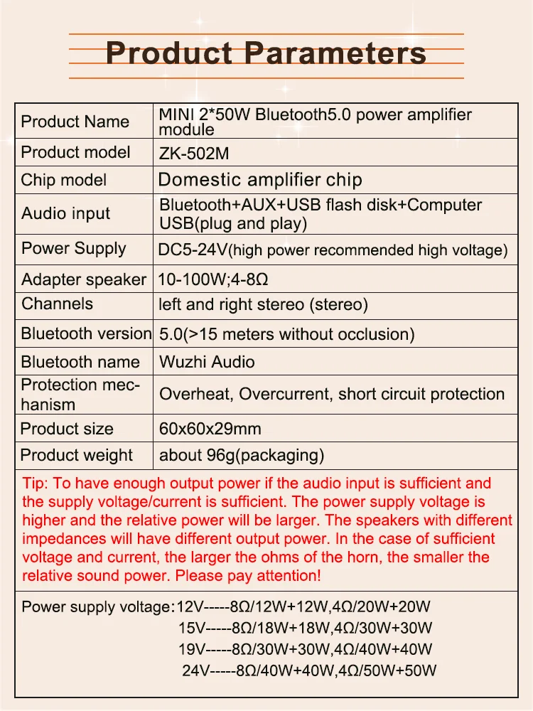 Советы: будет достаточно выходной мощности только тогда, когда достаточно аудиовхода и достаточно источника питания/тока. Чем выше напряжение источника питания, тем выше относительная мощность и динамики с различными характеристиками будут иметь разную выходную мощность. В чехол достаточно напряжения и тока, чем больше Ом динамика, тем ниже относительная Мощность звука, пожалуйста, обратите внимание!