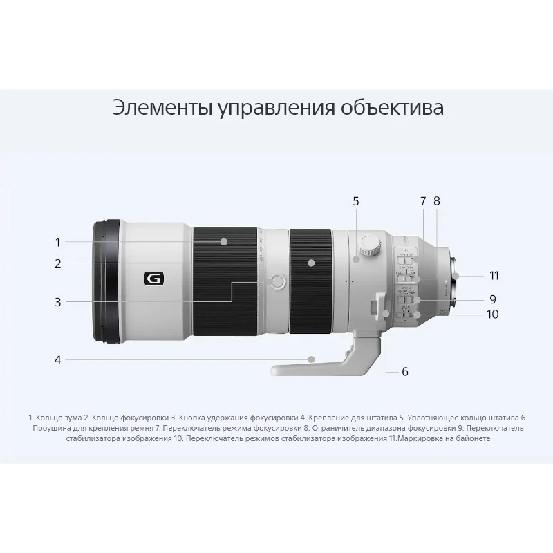 Байонет Sony E. Полный кадр, 35 мм. Фокусное расстояние 200–600 мм. 17 групп / 24 элемента. Макс. значение диафрагмы F/5.6–6.3. 11 лепестков диафрагмы. Стабилизатор Optical SteadyShot. Размеры 111,5 x 318 мм. Вес 2.1 кг.