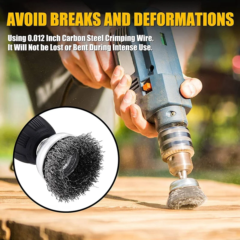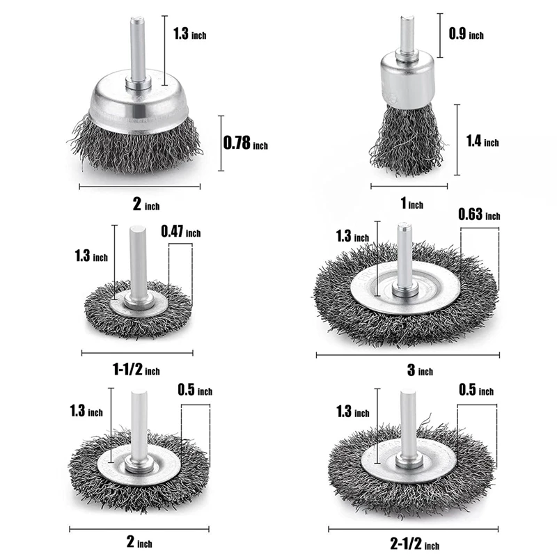 6 различных диаметр сверла проволочные колеса: в том числе 3 дюймов (75 мм) x1, 2 дюйма (50 мм) x1, 2-1/2 дюйма (63 мм) x1, 1,57 дюйма (40 мм) x 2 щетки колеса провода и 2 дюйма (50 мм) x1 щетка для чашки провода. Больший размер подходит для больших площадей для быстрой работы, а меньший размер позволяет узким пространствам и тонкой работе.