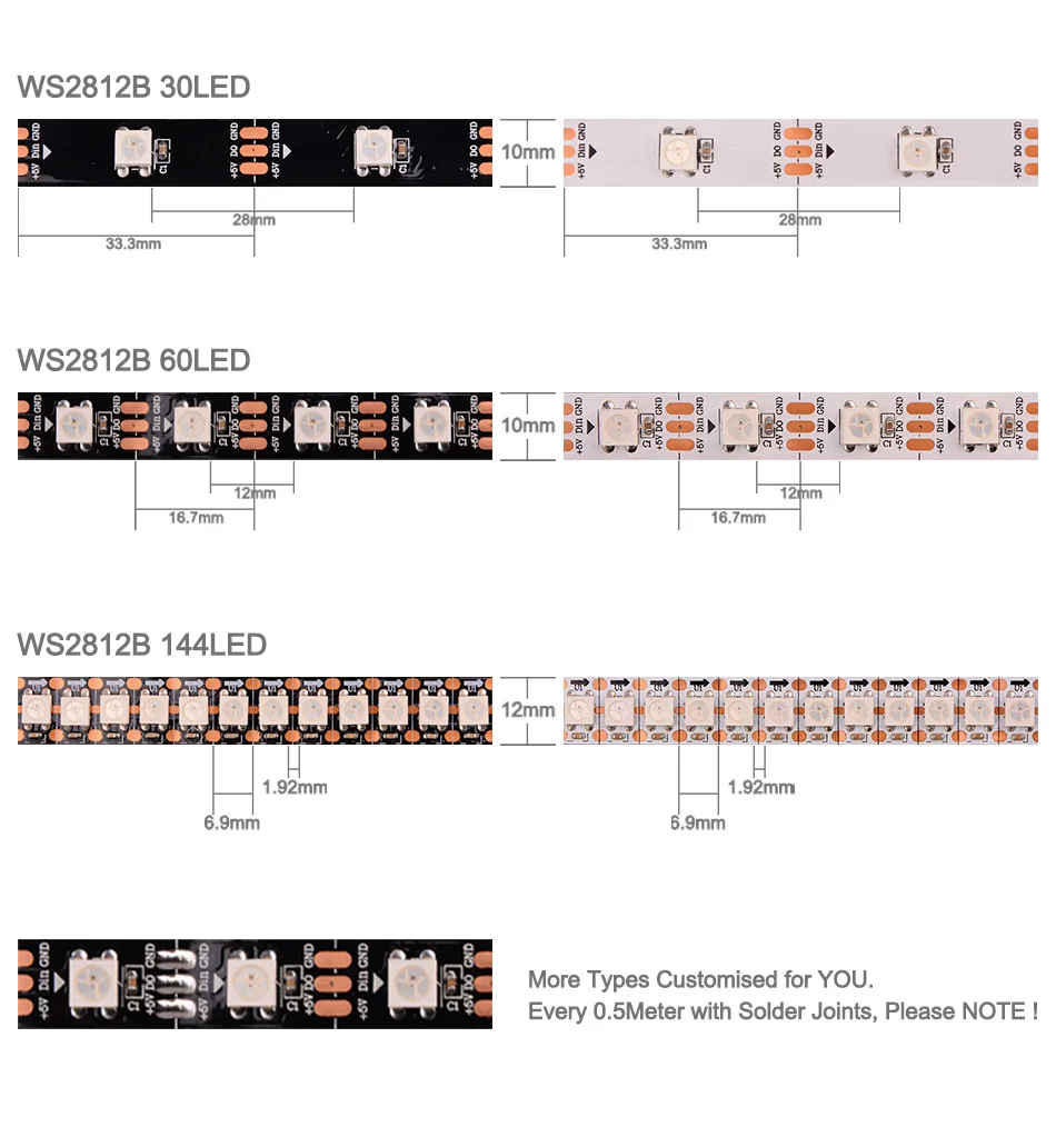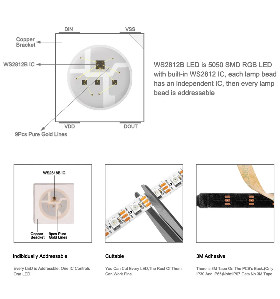 4. WS2812B Светодиодная лента может быть разрезана между каждым светодиодом, пожалуйста, не сгибайте полоску резко.