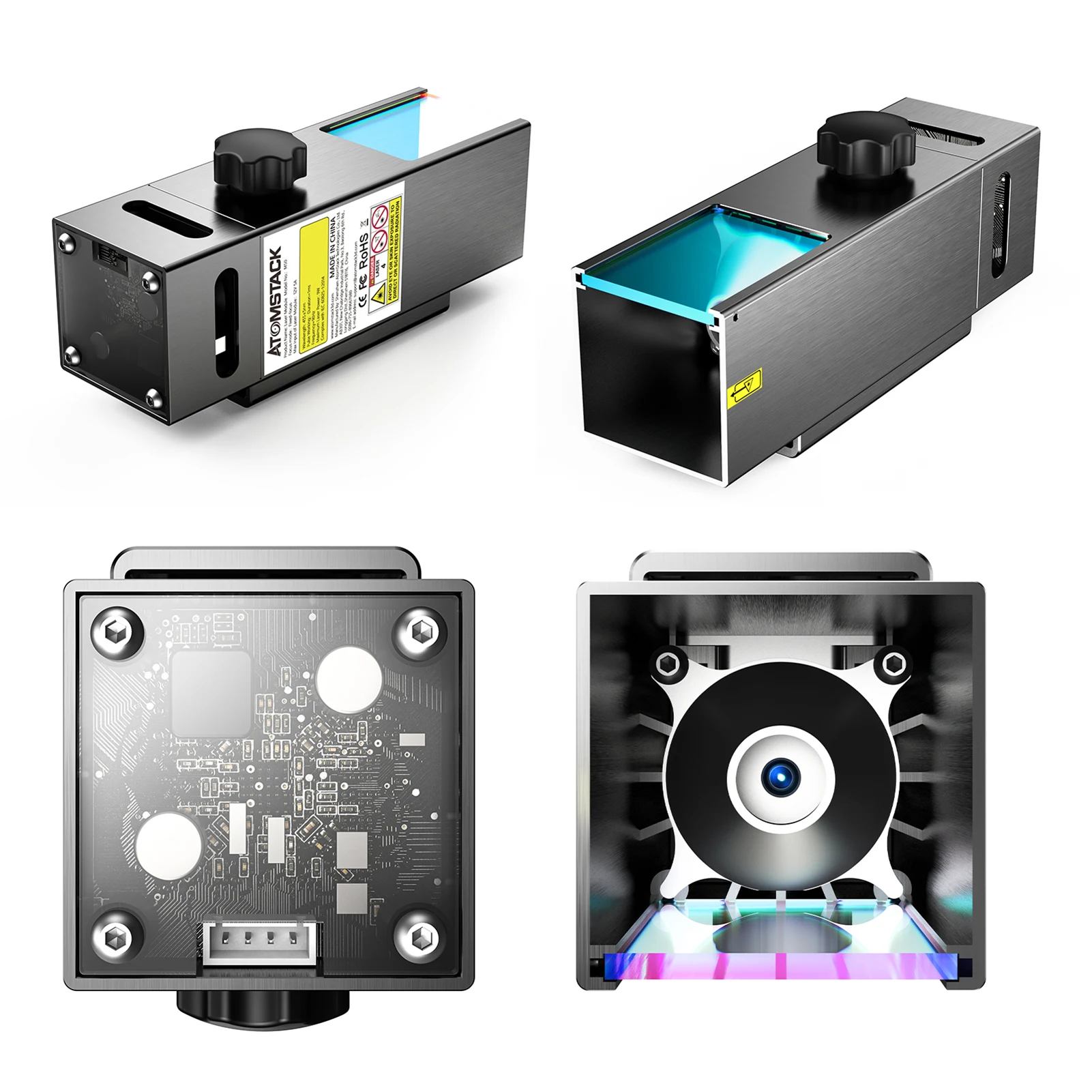 ▶M50 гравировальный лазерный модуль изготовлен из алюминия, прочный и долговечный. Авиационный алюминиевый TTL драйвер платы с охлаждающим вентилятором может обеспечить непрерывную длительную работу.
