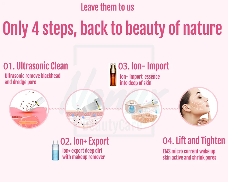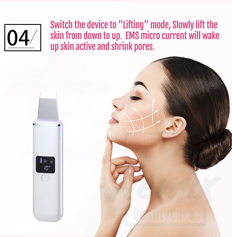 2. Доступны четыре различных режима работы: ультразвуковая очистка, уход за EMS, экспорт ионов, импорт ионов, полное соответствие вашим требованиям ежедневного ухода за кожей, практичное решение для вашего лица probl ems, например, удаление акне, борется с угрей, сужает поры, уменьшает морщины и подтягивает кожу.