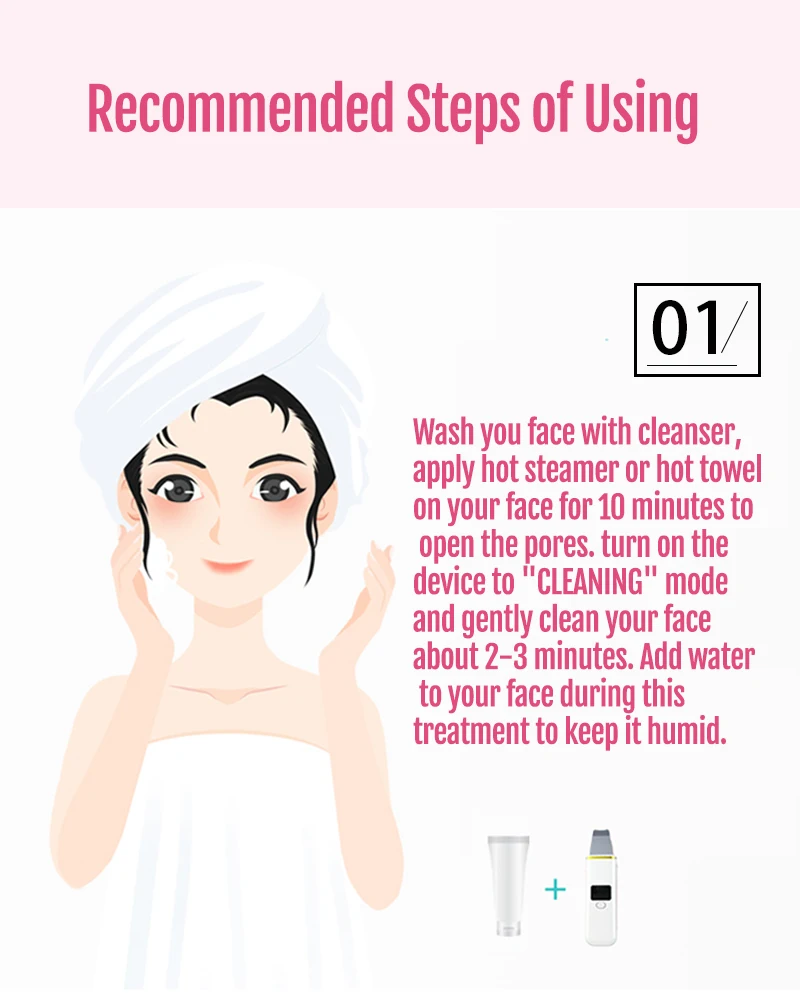 01. Мойте лицо очищающим средством, нанесите горячий отпариватель или горячее полотенце на лицо в течение 10 минут, чтобы открыть поры. Включите устройство в режим «чистка» и аккуратно очистите лицо около 2-3 минут. Добавьте воду в лицо во время этого лечения, чтобы сохранить ее влажной.