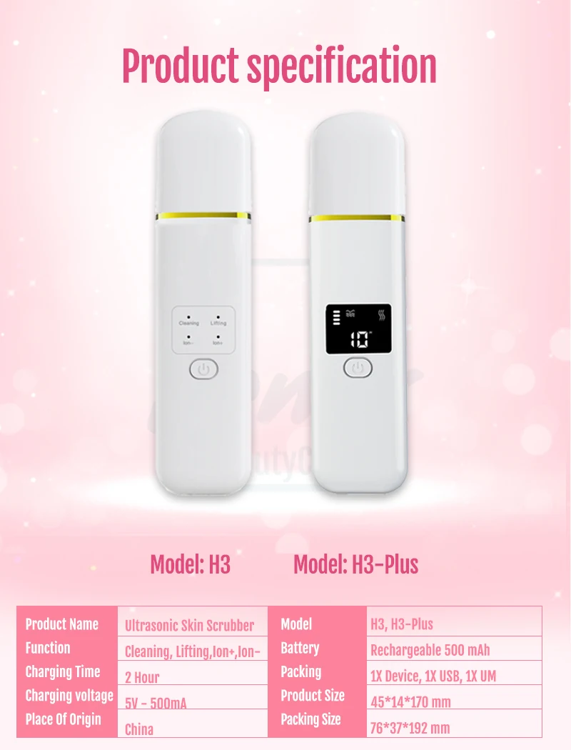 Название продукта: ультразвуковой скруббер для кожи; Функция: очистка, подъем, Ион +, Ион-; Время зарядки: 2 часа; Напряжение зарядки: 5 В-500 мА; Место происхождения: Китай; модель: H3, H3-Plus (обе модели одинаковы, H3-plus имеют ЖК-экран, H3 не имеют ЖК-экрана); Батарея: Перезаряжаемый 500 мАч; Упаковочный лист: 1 устройство, 1 USB, 1 мкм; Размер продукта: 45*14*170 мм; Размер упаковки: 76*37*192 мм