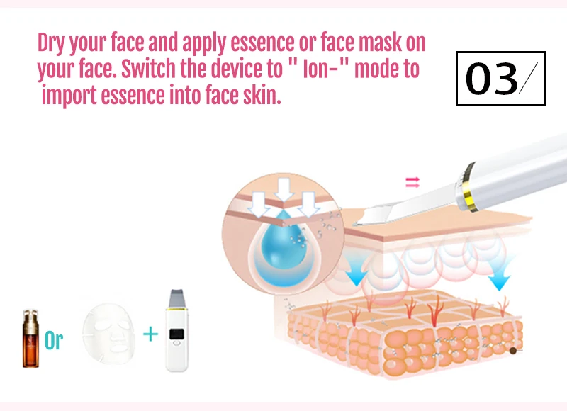 03. Высушите лицо и нанесите эссенцию или маску на лицо. Переключите устройство в режим «Ion-», чтобы импортировать эссенцию в кожу лица.