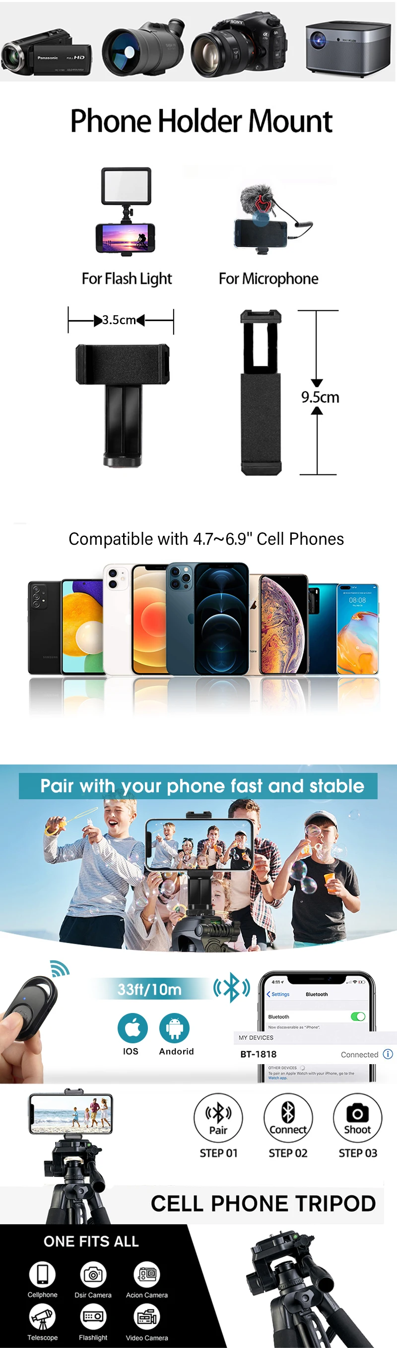 Этот легкий штатив поставляется с удобной сумкой для переноски; БЫСТРОРАЗЪЕМНАЯ пластина с винтом 1/4, подходит для большинства мобильных телефонов, камер, gopro и другого оборудования; Вращающийся на 360 градусов держатель мобильного телефона и пульт bluetooth, что более удобно для дистанционного управления, поможет вам сделать точные снимки самостоятельно.