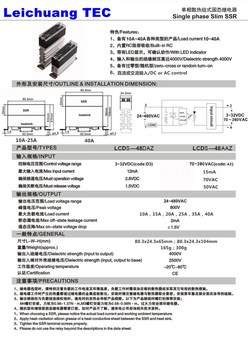 LeiChuang TEC DIN rail mount SSR 10A-40A DC TO AC, AC to AC