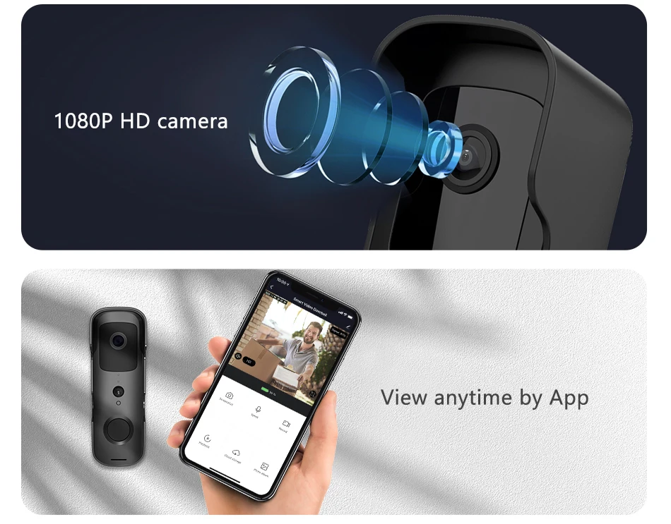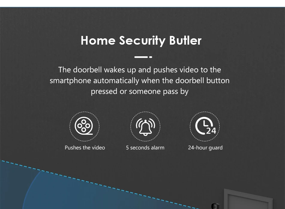 Дверной звонок просыпается и автоматически подталкивает видео к смартфону, когда нажата кнопка дверного звонка или кто-то проходит мимо.