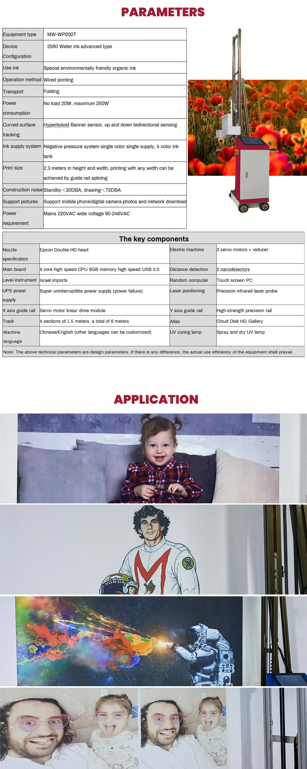 Для удовлетворения спроса клиентов на большинство широкоформатных принтеров Maxwave запустил новый горизонтальный настенный принтер. Это прямое к стене струйный принтер принимает импортированный Epson сопло из Японии. Картина четкая и яркая, конструкция машины гладкая, корпус машины съемный, портативный и простой в использовании. Эта машина применима к различным стеновым рисункам, таким как шпатлевка для стен, краска стен, стен плитки, диатомовая грязевая стена, холст, бумага и т. д.