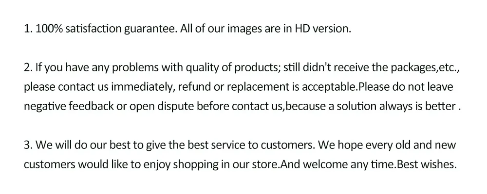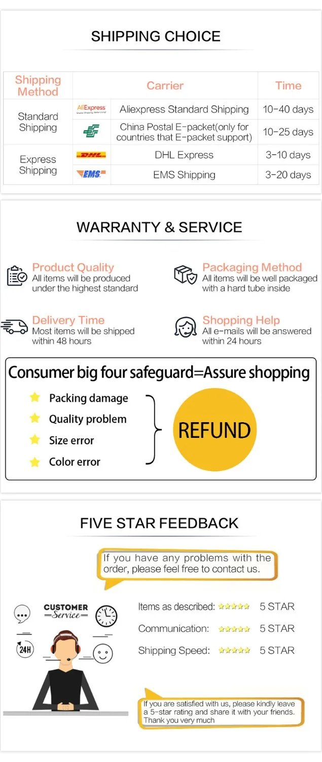 3. Пожалуйста, свяжитесь с нами перед тем, как оставить нейтральный (3 звезды) или отрицательный (1-2 звезды). Мы постараемся сделать все возможное, чтобы решить проблему и оставить вам счастливое настроение покупок здесь. Спасибо!