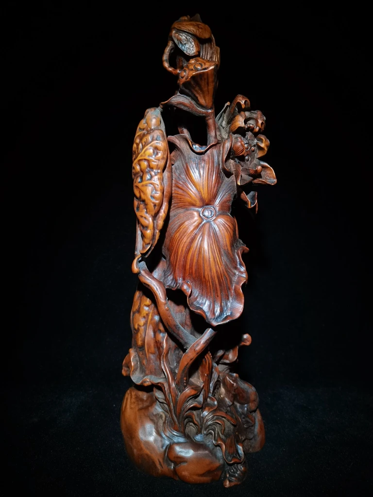 Старый Китай boxwood ручное литье цветок лист лотоса лягушка Статуэтка украшение H 8,7"