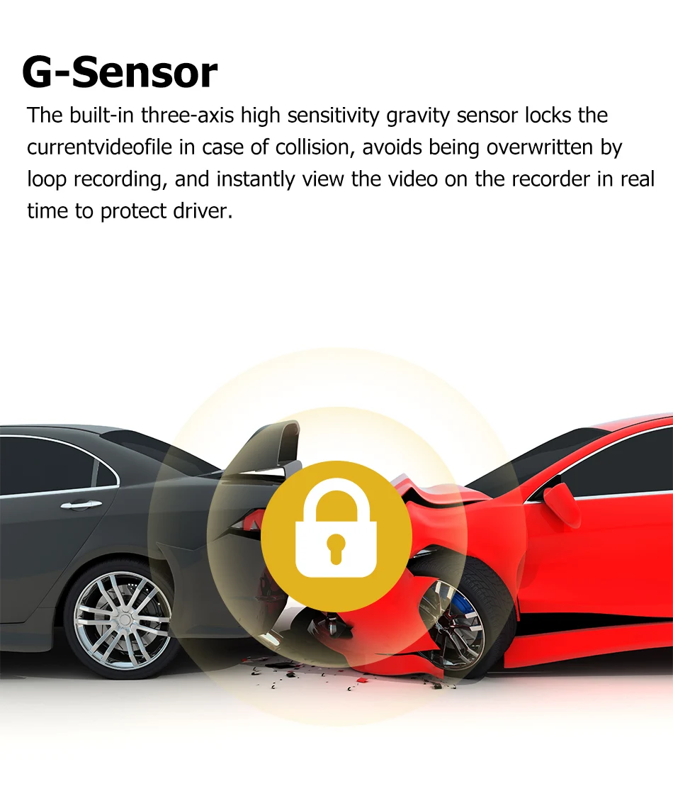 G-сенсор может блокировать токовый видеорегистратор восстанавливается в критические моменты (например, в случае автомобильных аварий), тем самым защищая ваши высококачественные записи.