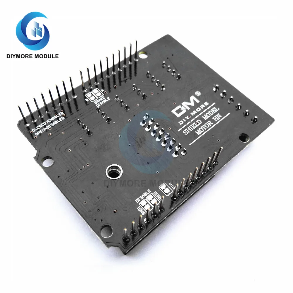 Щит двигателя должен питаться только от внешнего источника питания. Потому что L298HN IC, установленный на щите, имеет два отдельных подключения питания, один для логики и один для драйвера питания двигателя. Требуемый ток двигателя часто превышает максимальный ток USB.