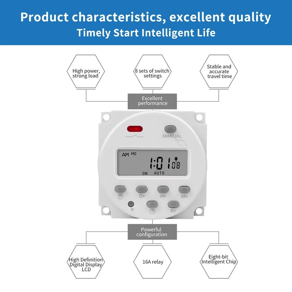 Особенности: 1. Простая установка: этот продукт очень прост в установке, дополнительные инструменты не требуются, и процесс установки очень удобен. 2. ЖК-экран: Этот продукт имеет большой ЖК-экран, легко читаемый ЖК-дисплей, вы можете прочитать данные напрямую. 3. Повторите программы с 8 настройками вкл/выкл и вкл/выкл вручную: Этот продукт имеет повторяющиеся программы с 8 настройками вкл/выкл и вкл/выкл вручную. 4. Дизайн аккумуляторной батареи: Этот prodct имеет встроенную перезаряжаемую батарею, чтобы сохранить память, когда питание выходит из строя. 5. Функция обратного отсчета: Этот продукт имеет функцию обратного отсчета, максимум 24 часа обратного отсчета. Описание: Этот продукт является очень практичным управлением CN101S микрокомпьютерным переключателем управления временем, идеально подходит для домашнего использования в собранных панелях. Характеристики: Бренд: SINOTIMER Модель: CN101S Контактная нагрузка: 3600 Вт Ток переключения контактов: 16A Контактное напряжение переключения: 220 В переменного тока 50 ~ 60 Гц Контактная форма: переключатель 8 раз Номинальный ток: 16A Номинальное напряжение: CN101S-2 220VAC на английском языке, CN101S-4 DC12V на английском языке, CN101S-1 110VAC на английском языке, CN101S-3 DC24V на английском языке, CN101S-5 5VDC на английском языке (опционально) Характеристики защиты: 60 дней памяти о сбое питания Источник питания катушки: 24VDC Мощность катушки: 1 Вт Режимы выхода: выходная мощность Сертификация продукта: CE RoHS EMC LVD Посылка включает в себя: 1 шт. * CN101S таймер переключатель (butoon батарея включена) 1 шт. * Инструкция