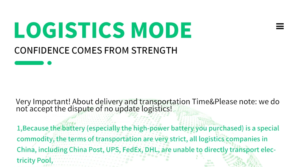 1,Because the battery (especially the high-power battery you purchased) is a special commodity, the terms of transportation are very strict, all logistics companies in China, including China Post, UPS, FedEx, DHL, are unable to directly transport electricity Pool,