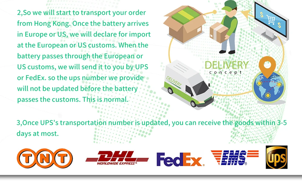 2,So we will start to transport your order from Hong Kong. Once the battery arrives in Europe or US, we will declare for import at the European or US customs. When the battery passes through the European or US customs, we will send it to you by UPS or FedEx. so the ups number we provide will not be updated before the battery passes the customs. This is normal.