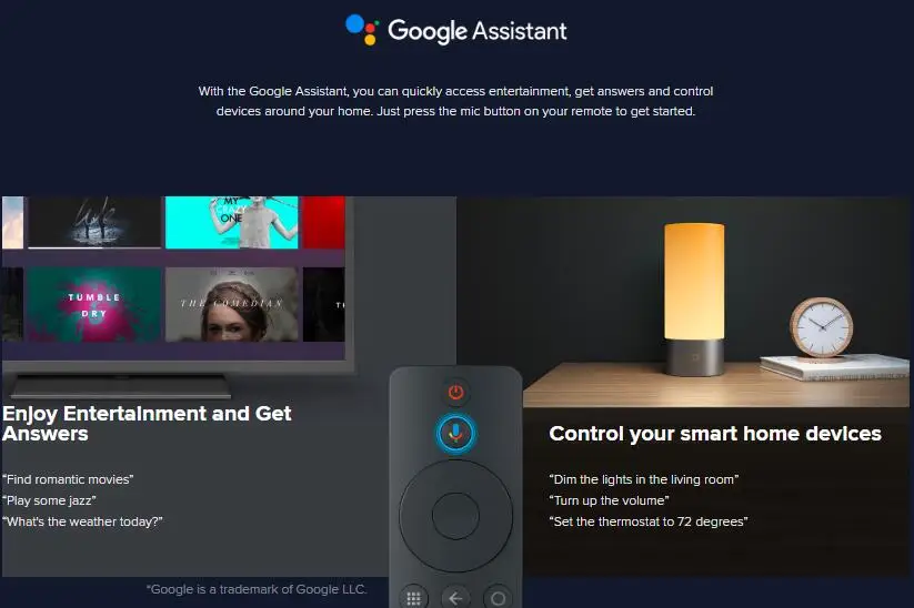 С помощью Google Assistant вы можете быстро получить доступ к развлекательным мероприятиям, получить ответы и управлять устройствами вокруг вашего дома. Просто нажмите кнопку mic на пульте дистанционного управления, чтобы начать работу.