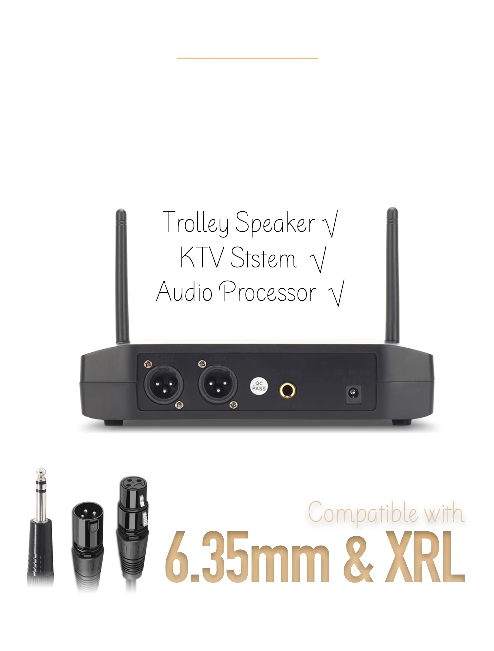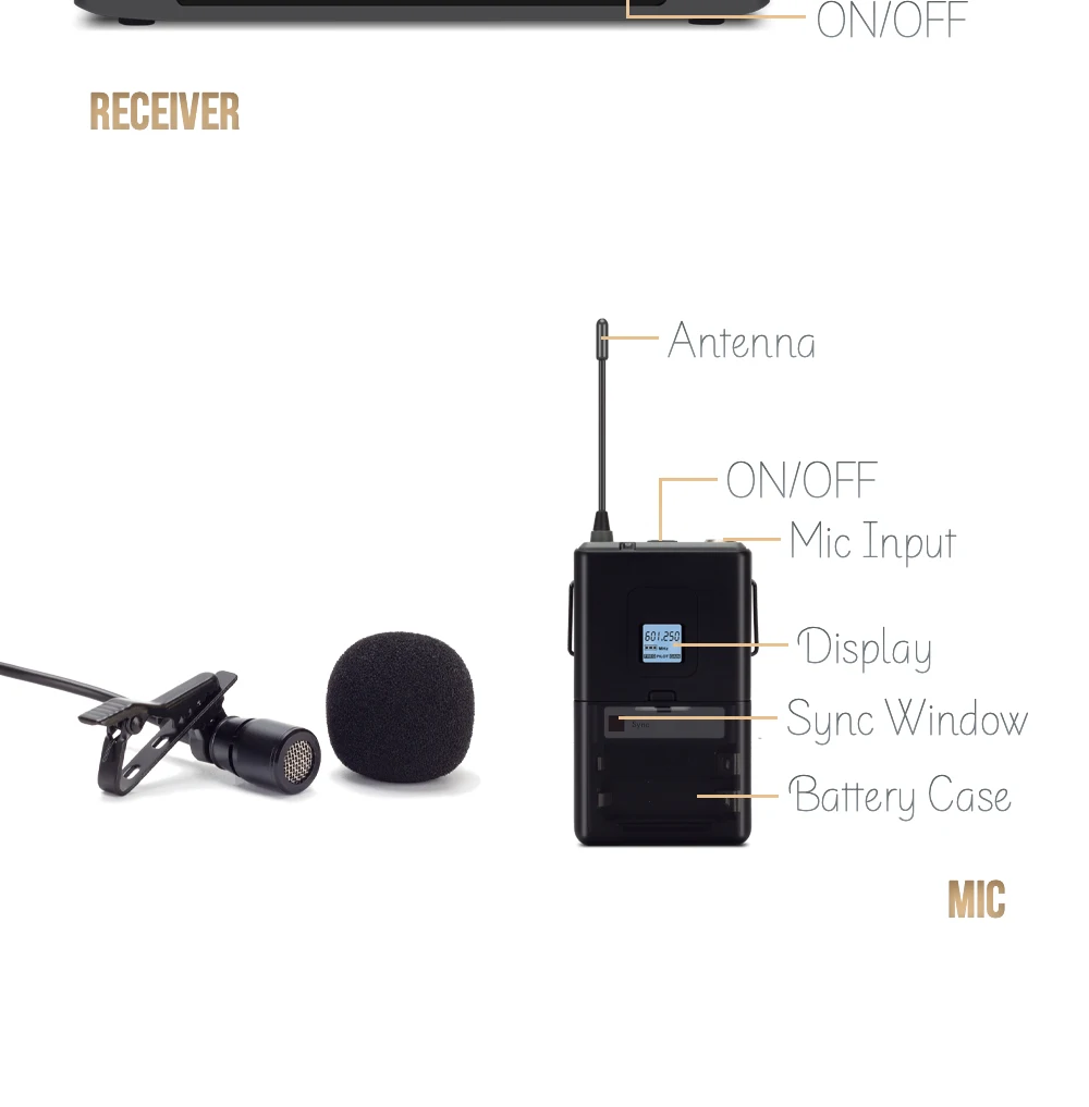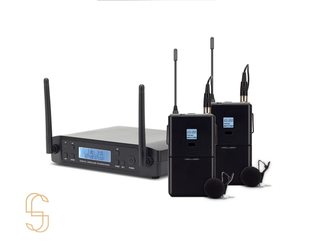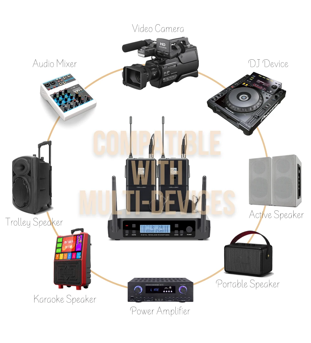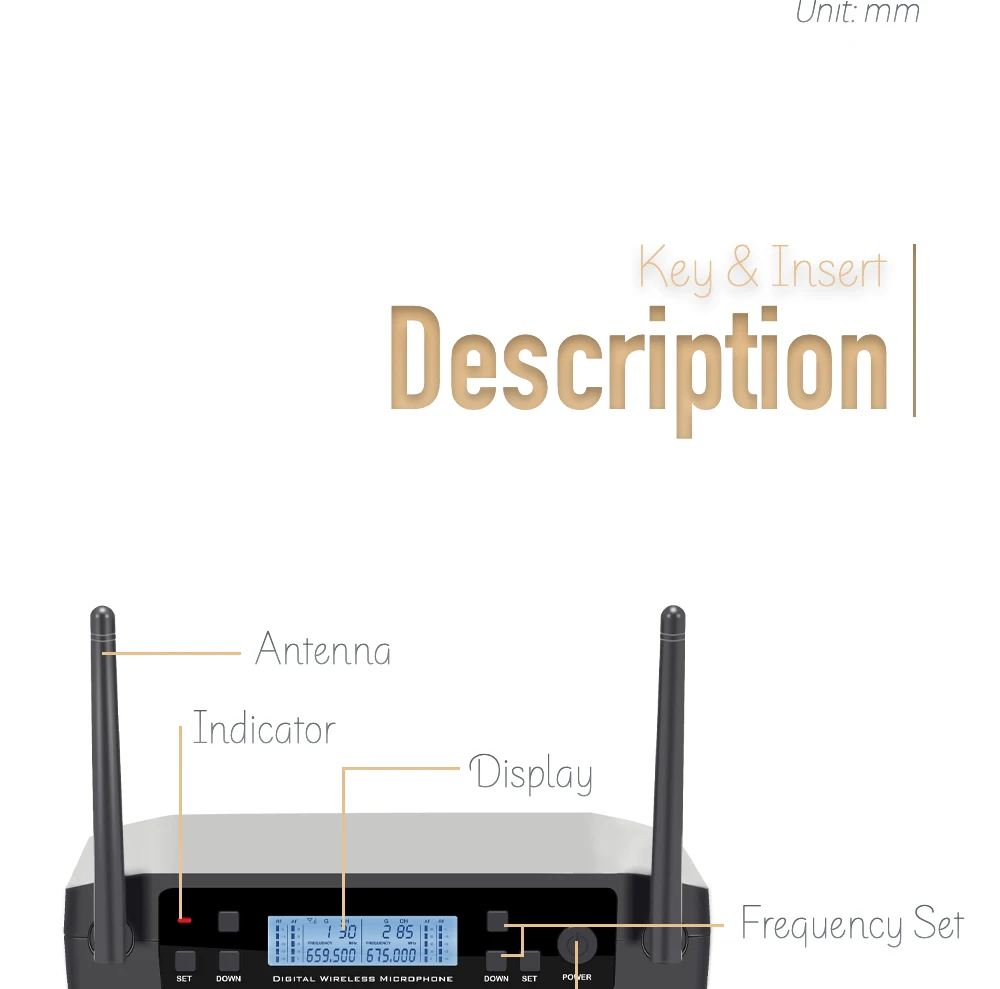 1 Dual channel dual antenna receive signal design, each channel has 100 selectable channels2.UHF band transmission signal, the frequency range in between 650MHz-690MHz, the signal step up between the 250KHz3 Receiver and transmitter are equipped with VA Holo LCD display, working state at a glance4 The back of the receiver is equipped with 2 rubber antennas to enhance the received signal and highlight the appearance of high-grade5 Contained one 6.3mm outputs and one balanced output, suitable for connecting a variety of external devices6 Microphone power consumption is 130mA, using 1.5V AA*2 rechargeable battery power supply, can be used for more than 6 hours7 Using distance: about 100 meters8 Audio and data use 32bit encryption transmission and independent ID code, effectively prevent crosstalk and interference9 Transmitter and receiver use 8bit encryption infrared transmission synchronization mode10 The receiver can observe the battery working state of the transmitter with a glance11 Use high fidelity moving coil microphone capsule, so that your voice is more clear and real12 The microphone system contain the features of intellgent mute function when you press and hold the power button to turn on the handheld microphone until the "94ON" shows on the screen, the intellgent mute on. You don't need to worry about the microphone drop, that will not occur the harsh sound because of the microphone mute during droping. And When the microphone stay on the table for 5 second, it will mute automatically. When over 5 mins, it will be turn on automatically.Host performance parameters:Frequency range: UHF 650MHz-690MHz;Frequency stability: 10PPM;Occupied bandwidth: ±150KHz;Transmission rate: 204.8Ksps;Modulation: DQPSK;Signal to noise ratio: >105dB;Distortion: <0.5%@1KHz;Receiving sensitivity: -105dBM;Frequency response: 30Hz-20KHz;Power supply: DC 12V-16V;microphoneTransmitter performance parameters:Power supply: DC 3V (1.5V AA*2);Microphone power consumption: 130mA;Transmit power: 10mW;Dynamic range: >100dB;Type: moving coil type;Frequency response: 30Hz-20KHz![]()