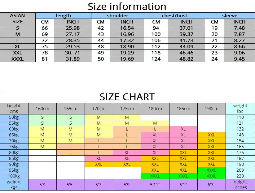 2. Наши размеры одежды меньше в Азии, чем в США и ЕС, например:Размер L США/ЕС = Азиатский размер XXL. Пожалуйста, измерьте размер в соответствии с одеждой, которую они обычно носят (не ваше тело), проверьте свой размер с таблицей размеров ниже перед покупкой, если ваши измерения ожидаются между двумя размерами, советуем выбрать самый большой размер. Если она не уверены в размере, пожалуйста, оставьте мне сообщение о ее весе и росте, я могу дать вам предложение. Примечание: возможны отклонения в размере от разницы 0,5-1 дюйм (ов) в связи с тем, что измерения выполнены вручную. (1 дюйм = 2,54 см), цвет товара может незначительно отличаться от цвета на фотографиях отклоняется немного отличаться от приведенных выше изображений вследствие различных особенностей цветопередачи на разных настроек монитора, спасибо за ваше понимание.