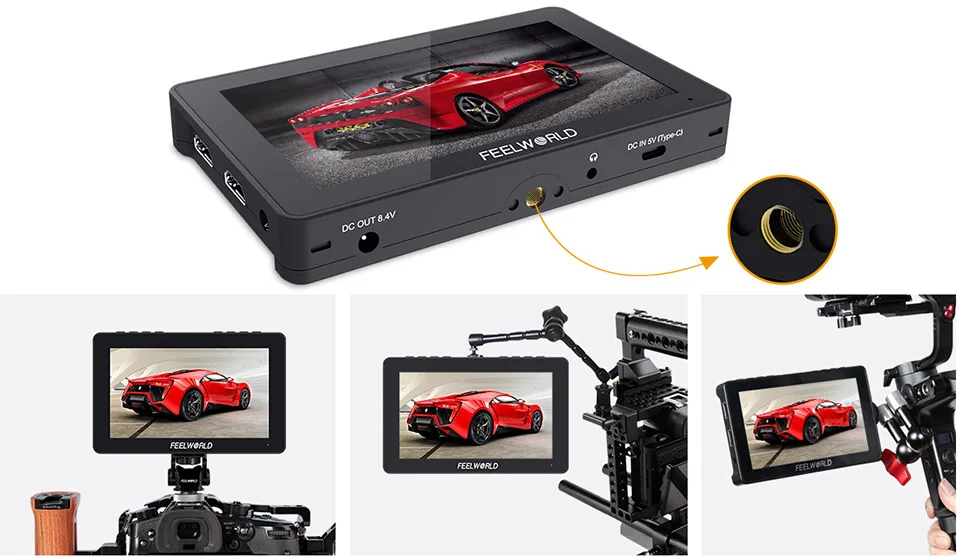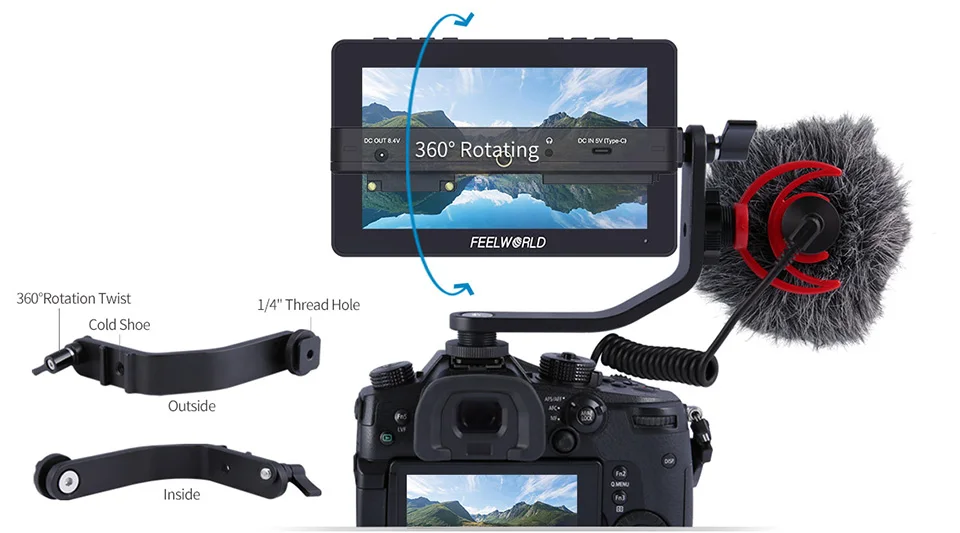 F5 Pro V2 имеет стандартные точки крепления 1/4 "(сверху, снизу, справа, средней задней части) для крепления к камерам и установкам. Вы можете не только установить его на монитор с помощью рычага наклона, но и установить его на Ручной Стабилизатор или надежно прикрепить его к верхней части камеры в качестве конечного видоискателя HD! Если вы установите его в нижней части устройства, вы также можете объединить функцию переворачивания изображения для поддержания правильной ориентации экрана!