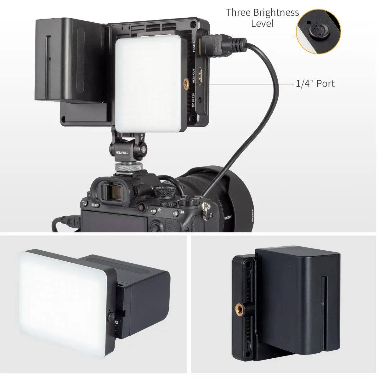 При подключении к камере имеет значение размер и вес вашего монитора. Мы побрили F5 Pro V2 до 245 г и добавили винты 1/4-20 сверху, снизу и справа для удобства клетки, такелажа адаптера и наклона руки. На задней панели монитора есть Пластина батареи F970 и комплект установки/питания, комплект установки/питания может заряжать и устанавливать внешнее оборудование, например беспроводной передатчик, светодиодный светильник и другие элементы, оснащенные зарядным устройством Sony F970. F5 Pro V2 совместим с большинством камер и hdmi-устройств и является идеальным компаньоном для шутеров, которые всегда на ходу.