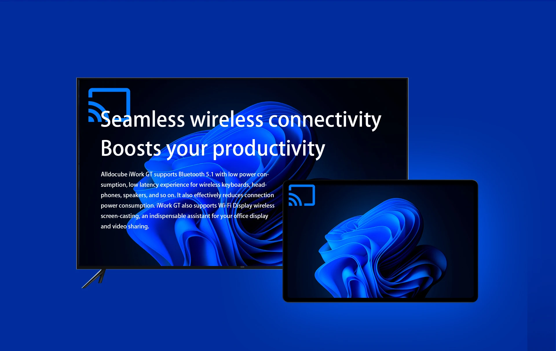 Alldocube iWork GT поддерживает Bluetooth 5,1 с низким энергопотреблением, низкой задержкой для беспроводных клавиатур, наушников, динамиков и т. д. Это также эффективно снижает энергопотребление подключения. IWork GT также поддерживает беспроводной экран Wi-Fi-литье, незаменимый помощник для вашего офисного дисплея и обмена видео.
