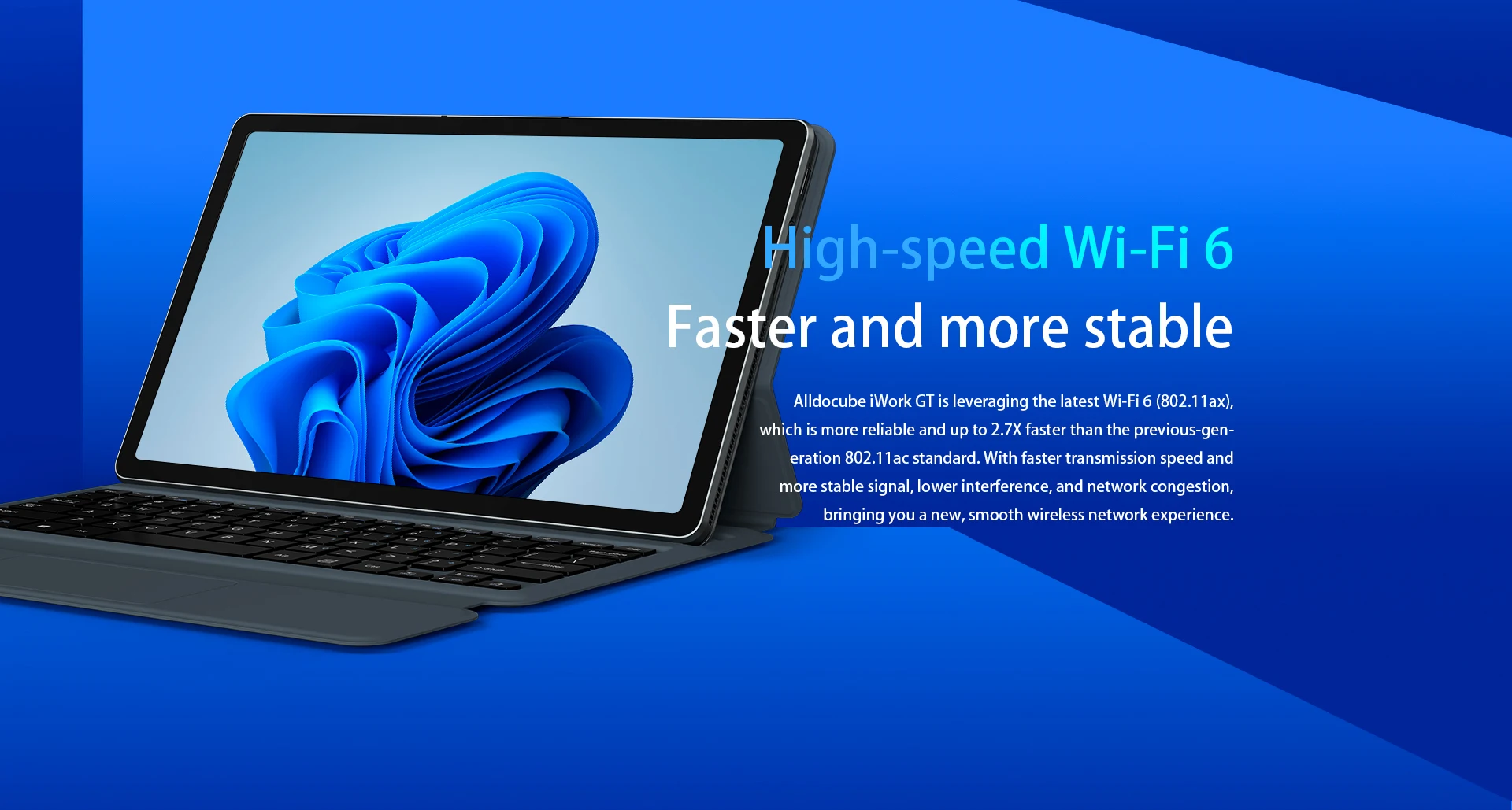 Alldocube iWork GT использует новейший Wi-Fi 6 (802.11ax), который является более надежным и до 2.7X быстрее, чем стандарт 802.11ac предыдущего поколения. С более быстрой скоростью передачи и более стабильным сигналом, более низкими помехами и перегрузкой сети, что обеспечивает вам новый, плавный опыт беспроводной сети.