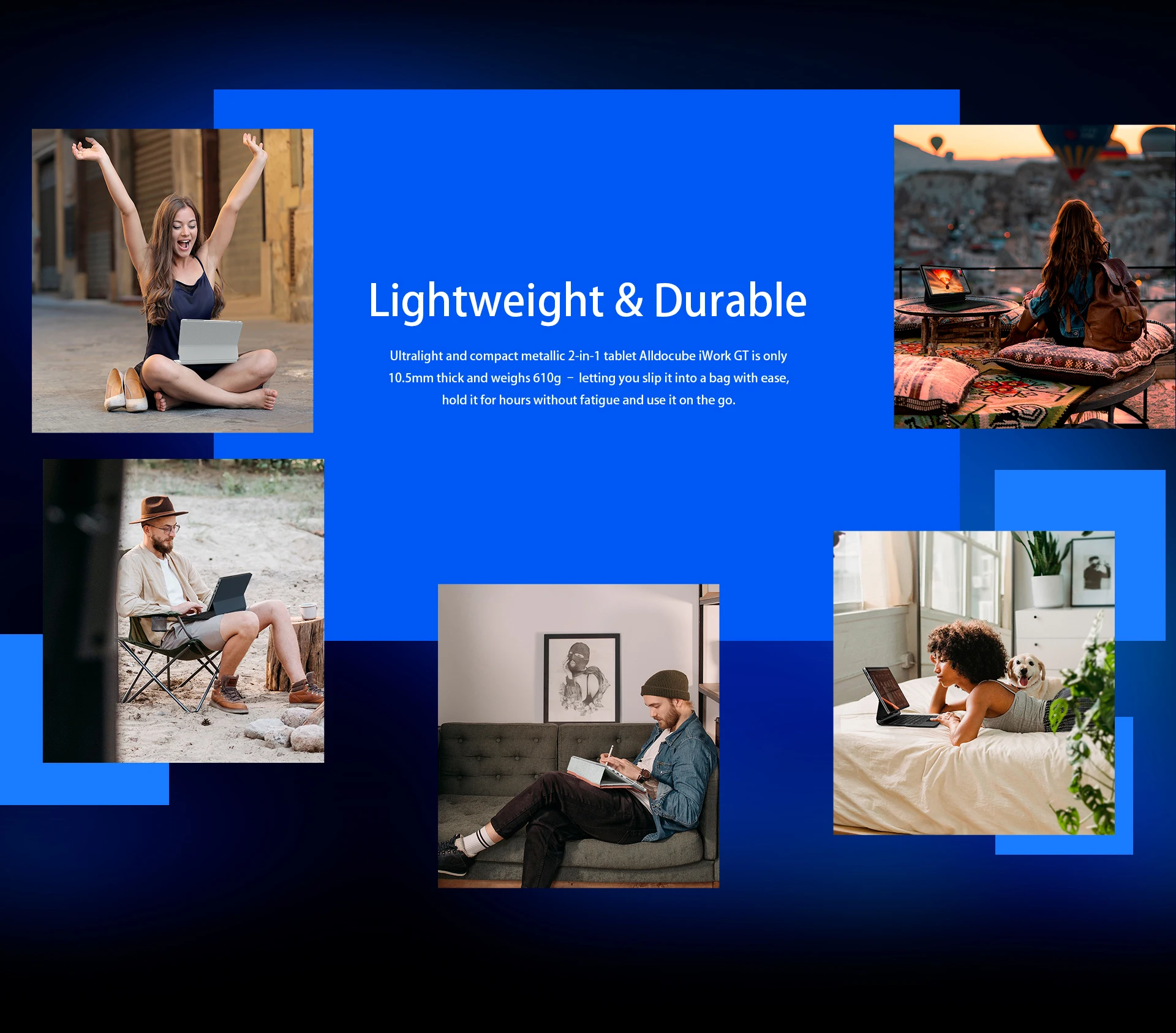 Очень легкая и компактная металлик 2-в-1 планшет ветвью Alldocube iWork GT-это только 10,5 мм толщиной и весит 610g-фотографировать будет легче и вставьте его в сумку с легкостью, держите его в течение нескольких часов без усталости и используйте на ходу.
