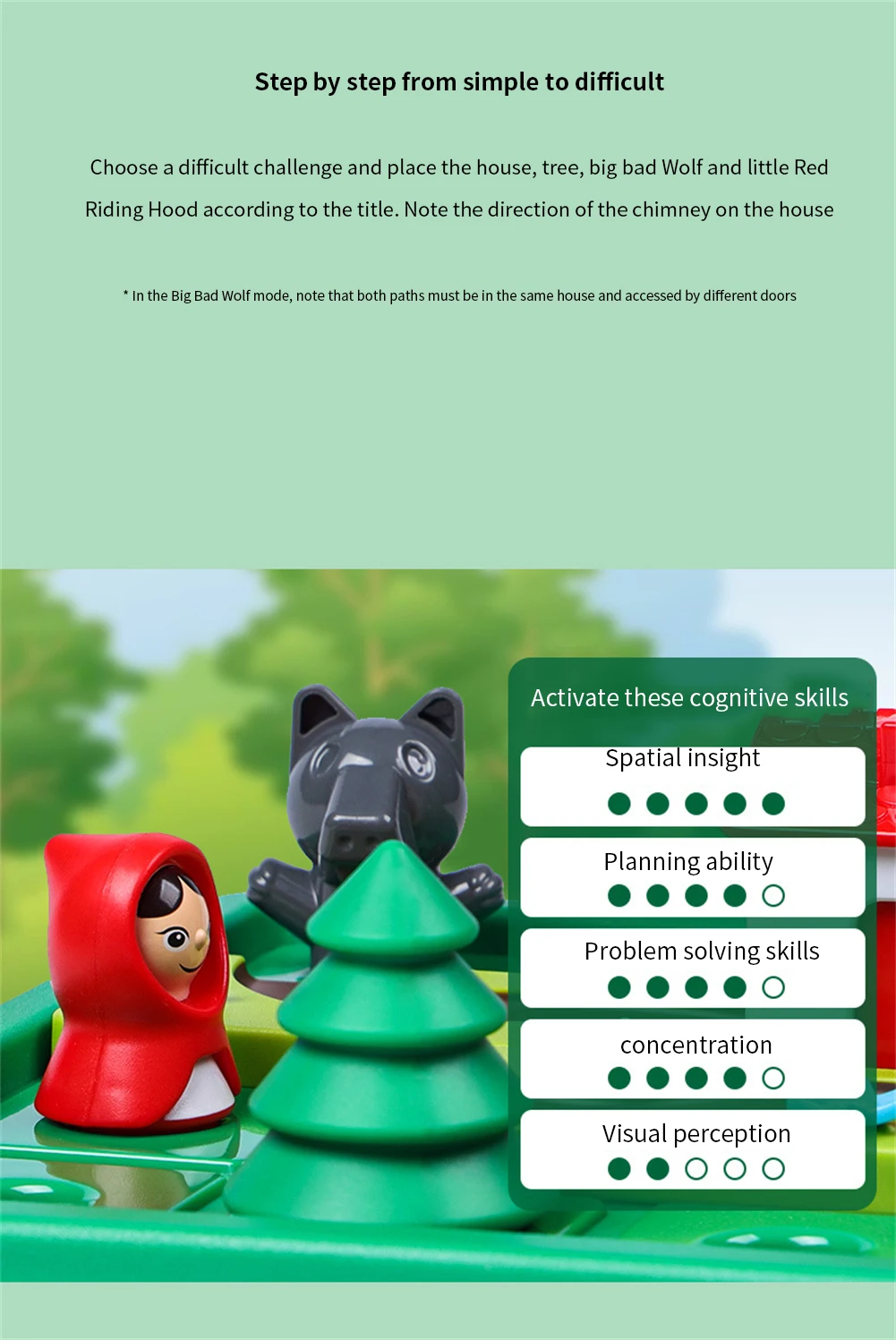 Красная Шапочка и игра Big Bad Wolf, включая 1 игровое шасси, 5 пазлов, 1 Красная Шапочка и 1 Большой плохой волк, чтобы привлечь внимание ребенка и стимулировать интерес ребенка.