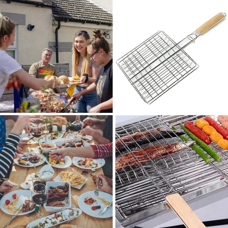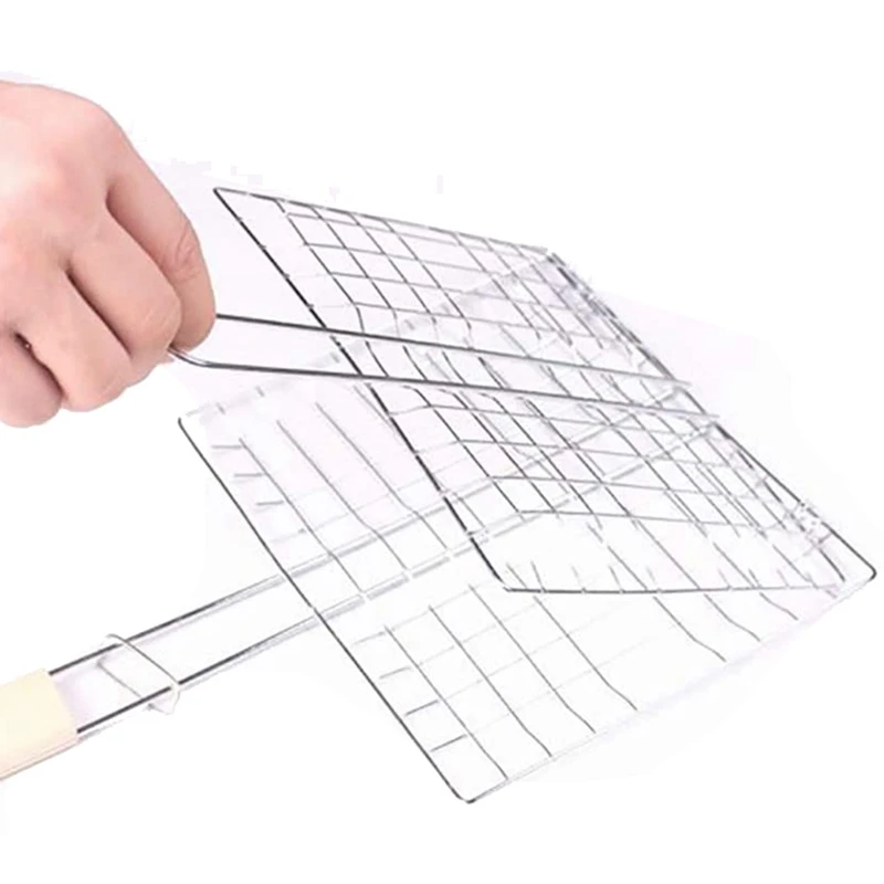 Пряжка и деревянная ручка: Эта Запираемая корзина для гриля блокирует продукты на месте и гриль для барбекю с деревянной ручкой способствует легкому переворачиванию продуктов на гриле. Более того, сетчатые зазоры идеально подходят для равномерного распределения тепла, предотвращая падение небольших кусочков продуктов через корзину для гриля.