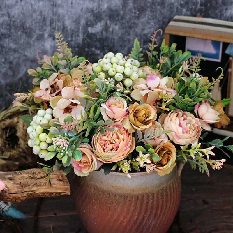 Vintage Artificial Flowers There are 2 bulk flowers in packag. Each bunch of flowers has 5 branches, a total of 1 big peony, 4 buds, 1 hydrangea, tropical fern leaves with berries, and each flower has fern leaves. Simply arrange it to appear full.