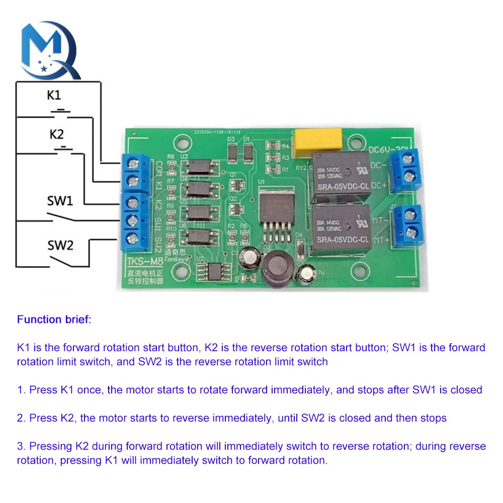 TKS-M8 не имеет функции синхронизации, поэтому строго говоря, он не может автоматически возвратно-поступательным образом. Однако с пусковым переключателем, стартовым переключателем (A) и концевым переключателем (B), он может достичь бесконечной возвратно-поступательной работы между точками A и B. Способ подключения: переключатель запуска и переключатель запуска подключены к K1, конечный выключатель подключен к K2, и SW1 и SW2 не подключены. Обратите внимание, что все выключатели обычно открыты.