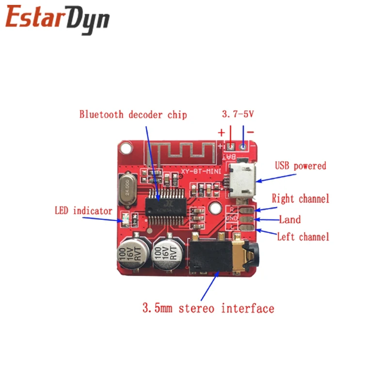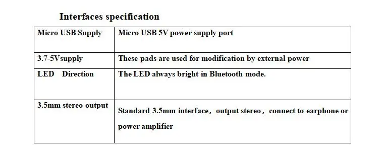 1. Характеристики параметровПитание 3,7-5 ВSNR90dBTHD + N-70dBCrosstalk-86dBDNR91dBПоддержка ProfileA2DP/AVCTP/AVDTP/AVRCP/HFPЛОС> 15 м2. Детали интерфейсаUSB poweredUniversal Micro USB 5V источника питания3,7-источник питания 5В PadExternal 3,7-5V литиевая батарея для подключения к электросетиСветодиодный индикатор bluetooth режим длинный синий светильник3,5 мм стерео аудио interfaceStandard 3,5 мм Интерфейс, выход стерео источник звука, подключите наушники, подключаться усилители и других устройствИнструкции:После включения питания синий индикатор загорается и переходит в режим Bluetooth; На английском языке отображается «устройство bluetooth готово к сопряжению», указывая, что режим Bluetooth введен и ожидает сопряжения; «XY_BT», который ищет мобильный телефон Bluetooth,-это имя устройства декодирующей платы. Нажмите на соединение, Плата декодера предлагает «устройство bluetooth Подключено успешно», указав, что Плата декодера и мобильный телефон успешно подключены, вы можете воспроизводить музыку. Как показано ниже.