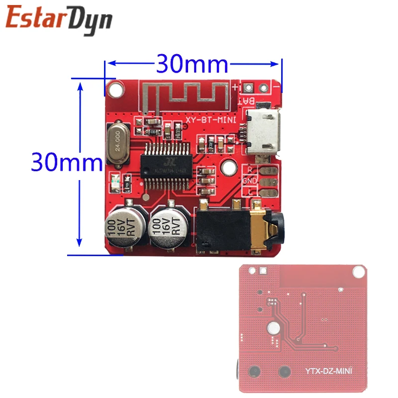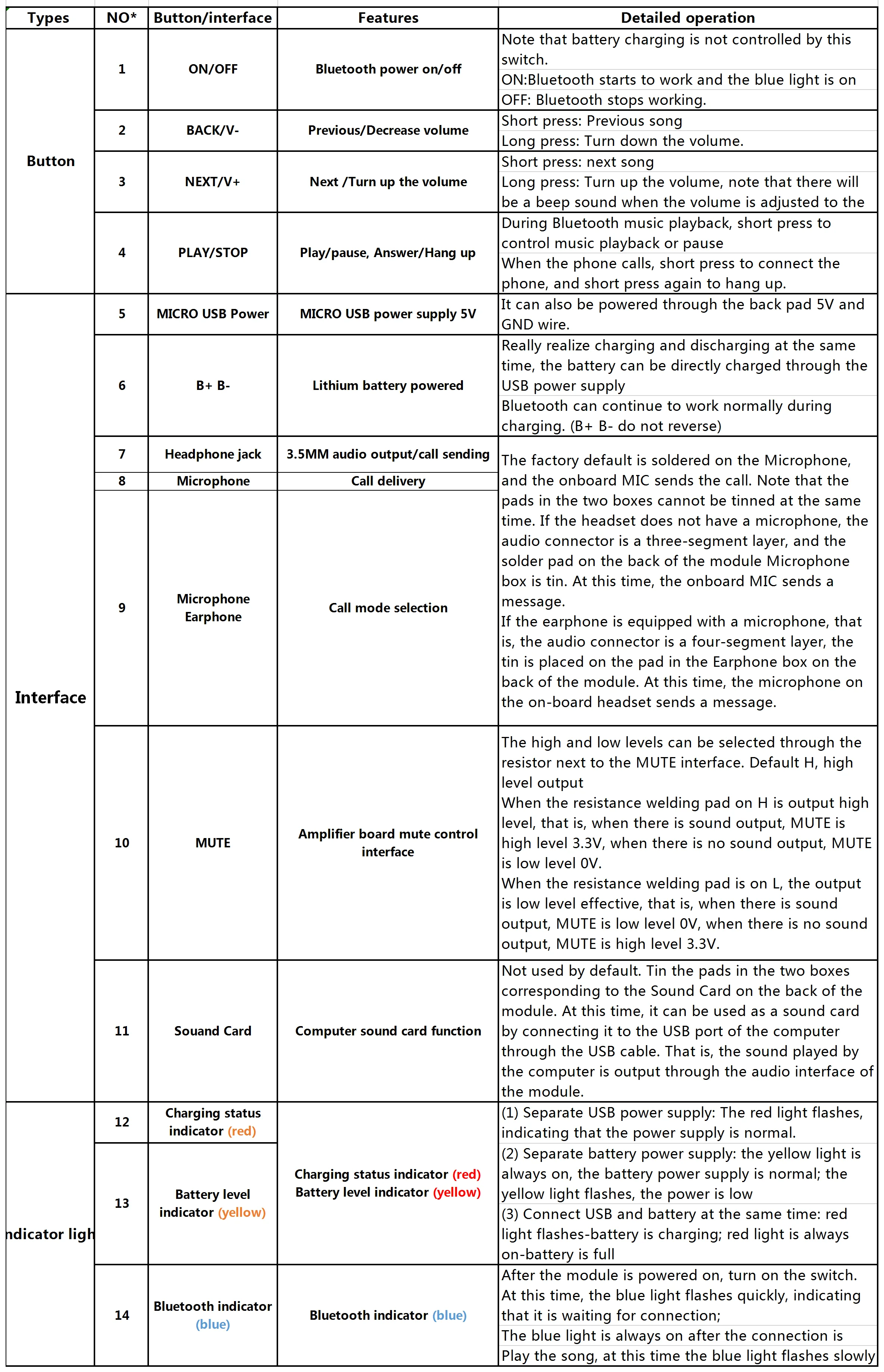 Переключение режима зарядки и разрядки в это время, после чего Bluetooth автоматически перезагружается, автоматически подключается и поддерживает предыдущее состояние воспроизведения) функция входящего голосового вызова: после подключения Bluetooth, включите звуковой режим вызова в настройках Bluetooth. Если телефонные звонки, вы можете ответить или повесить телефон через кнопку PLAY/STOP. Вы можете отправить товар напрямую от микрофона оригинальная гарнитура (при условии, что гарнитура имеет функции вызова, который представляет собой 4-сегментный тип и т. п.) либо Встроенный микрофон (по умолчанию), подробнее см. Описание функции. Когда используется звуковая карта компьютера: Закрепите колодки в двух коробках, соответствующих звуковой карте на задней части модуля, затем подключите его к usb-интерфейсу компьютера через usb-кабель, который может использоваться в качестве звуковой карты. То есть звук, воспроизводимый компьютером, выводится через аудиоинтерфейс модуля. Подробнее см. Описание функции. (По умолчанию не включено) размер изделия: