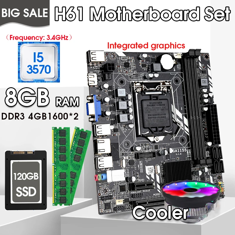 В комплект нашей материнской платы входит: 1 * материнская плата, 1 * I3-3570 процессор, 2*4G 1600 МГц Ram,1*120 Гб SSD,1 * кулер