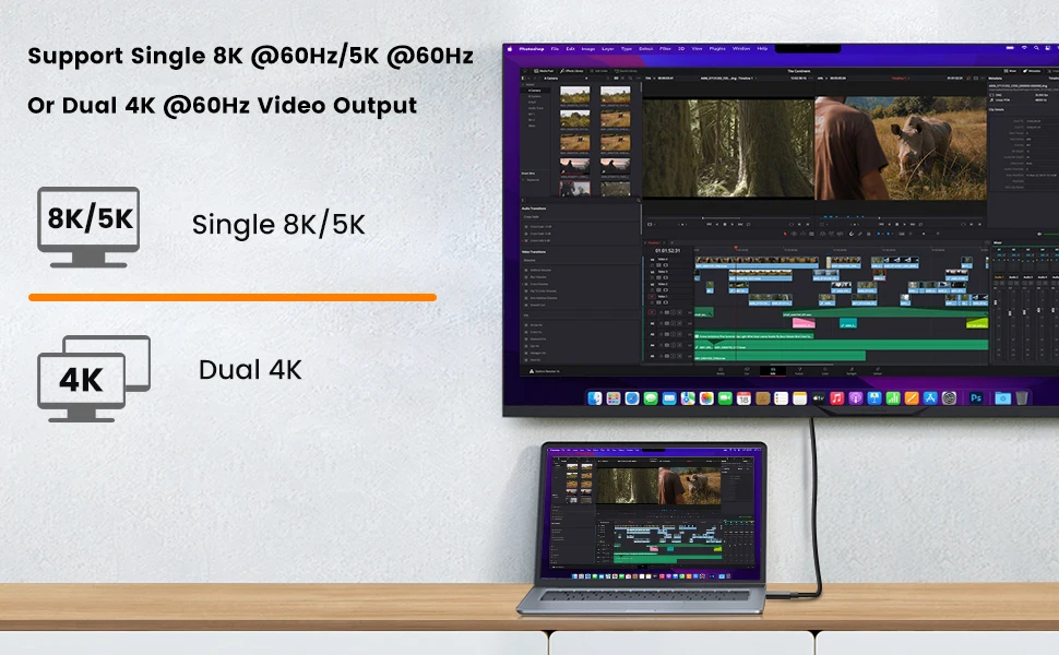 【8K@60Hz Video Display】 Display 8K/5K@60Hz video on a single screen, or 4K content on two screens at the same time. Notice: if you connect to USB C port(Not Thunderbolt port) for video output, please make sure your device supports DisplayPort Alternate Mode (Alt Mode). This setup can only produce one 4K display.