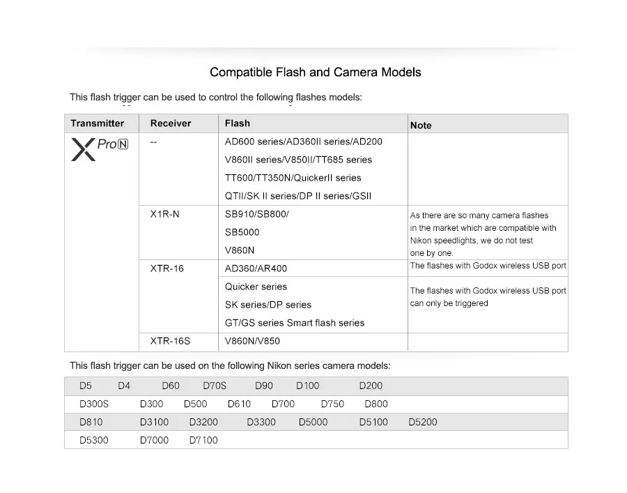 Описание товараМодель: Xpro-N Совместимая камера s:Nikon DSLR camera (i-TTL II autoflash) поддерживает камеры s, которые имеют разъем для синхронизации ПК.Контроль экспозиции вспышкиАвтовспышка TTL: E-TTL IIРучная Вспышка: ДаСтробоскопическая вспышка: ДаФункцияВысокоскоростная синхронизация: ДаСекундная синхронизация: ДаБлокировка вспышки: ДаПомощь в фокусировке: ДаМоделирующая лампа: Управляйте модельной лампой с помощью триггера вспышкиПчеловод: Управляйте пчеловодом с помощью триггера вспышкиБеспроводной окружающая Обстановка: ресивер конец может управлять камерой съемки через 2,5 мм кабель синхронизацииНастройка зума: Отрегулируйте значение зума передатчикомФункция TCM: преобразует значение съемки TTL в выходное значение в узле MОбновление прошивки: обновление через usb-порт Type-CФункция памяти: настройки будут храниться через 2 секунды после операции lasht и восстановиться после перезапускаБеспроводная вспышкаДальность передачи (прибл. Фунт стерлингов©Фунт 0-100 мВстроенный беспроводной: 2,4GРежим модуляции: MSKКанал: 32Беспроводной идентификатор: 01-99Группа: 16 ДругоеДисплей: большая ЖК-панель, подсветка выключенаРазмер/вес: 90x58x5 0 мм/80 г Описание товараРазмер: X1R-NХарактеристики:Бренд: GodoxМодель: X1R-NТип: для NikonСовместимость с: для цифровых зеркальных камер Nikon (i-TTL autoflash); Поддержка всех камер с разъемом для синхронизации ПКВстроенная система дистанционного управления: Беспроводная передача 2,4GМетод модуляции: MSKИсточник питания: 2 * батарейки типа ААКонтроль экспозиции:Ручная Вспышка: ДаАвтоматическая Вспышка TTL: i-TTLTTL контроль:Высокая скорость синхронизации: ДаКомпенсация экспозиции вспышки: Да, 3 остановки с шагом 1/3 остановкиБлокировка вспышки: ДаФокусировка: ручная работаМульти Вспышка: Да (AD360 tt/ TT685N как приемник)Синхронизация второго занавеса: Да (настройка на камере)Моделирующая вспышка: Да, работает с камерой; Кнопка предварительного просмотра глубины поляБеспроводная вспышка:Функция Wireles: совместимость с Nikon CLS (создание системы освещения)Управляемая подчиненная Группа: макс. 6 групп (M/A/B/C/D/E)Дальность передачи (прибл.):100 метровКанал: 32 каналаДругие:Набор задержки синхронизации: Да (0-10 мс, используйте 100US в качестве блока)Настройка зума: Фокусное расстояние можно регулировать через передатчикПанель дисплея: широкая ЖК-панель, Подсветка ВКЛ/ВЫКЛВыходной интерфейс: приемник: Используйте 2,5 мм кабель синхронизации для выводаФункция памяти: настройки будут храниться через 2 секунды после последней операции и восстановиться после перезапускаПриемник Размеры/Вес: 7*6,5*4,7 см/68,5 гПосылка Размеры: 11*5,5*11 см/4,3*2,2 * 4.3inПосылка Вес: 192g/6,8 oz Посылка:1x Godox XPro-N беспроводной триггер вспышки1x Godox X1R-N приемник1x кабель дистанционного управления (N1)1x Дистанционный кабель (N3)1x адаптер синхронизации1 подарок