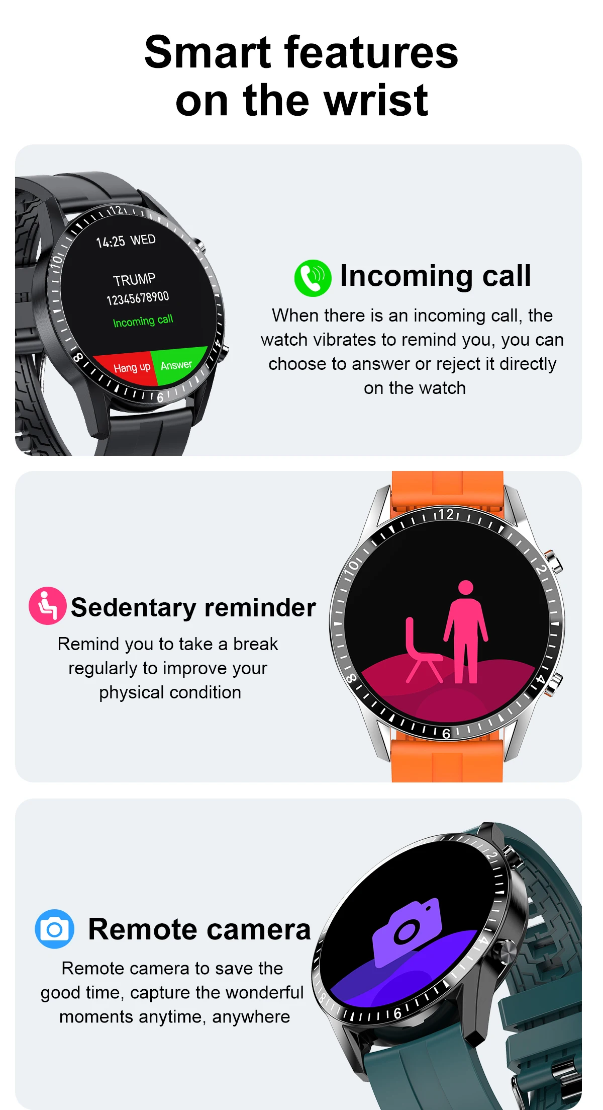 Прием/отклонение телефонных звонков/телефонных звонков с циферблатом, мониторинг сердечного ритма, мониторинг кровяного/кровяного давления, мониторинг сна, напоминание о сидячем положении, шагомер/потребление калорий/запись отслеживания/время упражнений, напоминание о звонках и дисплей, сообщение толкается и отображается, камера дистанционного управления, автоматическое измерение сердечного ритма, мульти-спорт, измерение, напоминание о часах, напоминание о тревоге, 5 видов циферблатов по умолчанию. Индивидуальные Циферблаты часов в приложении являются необязательными.
