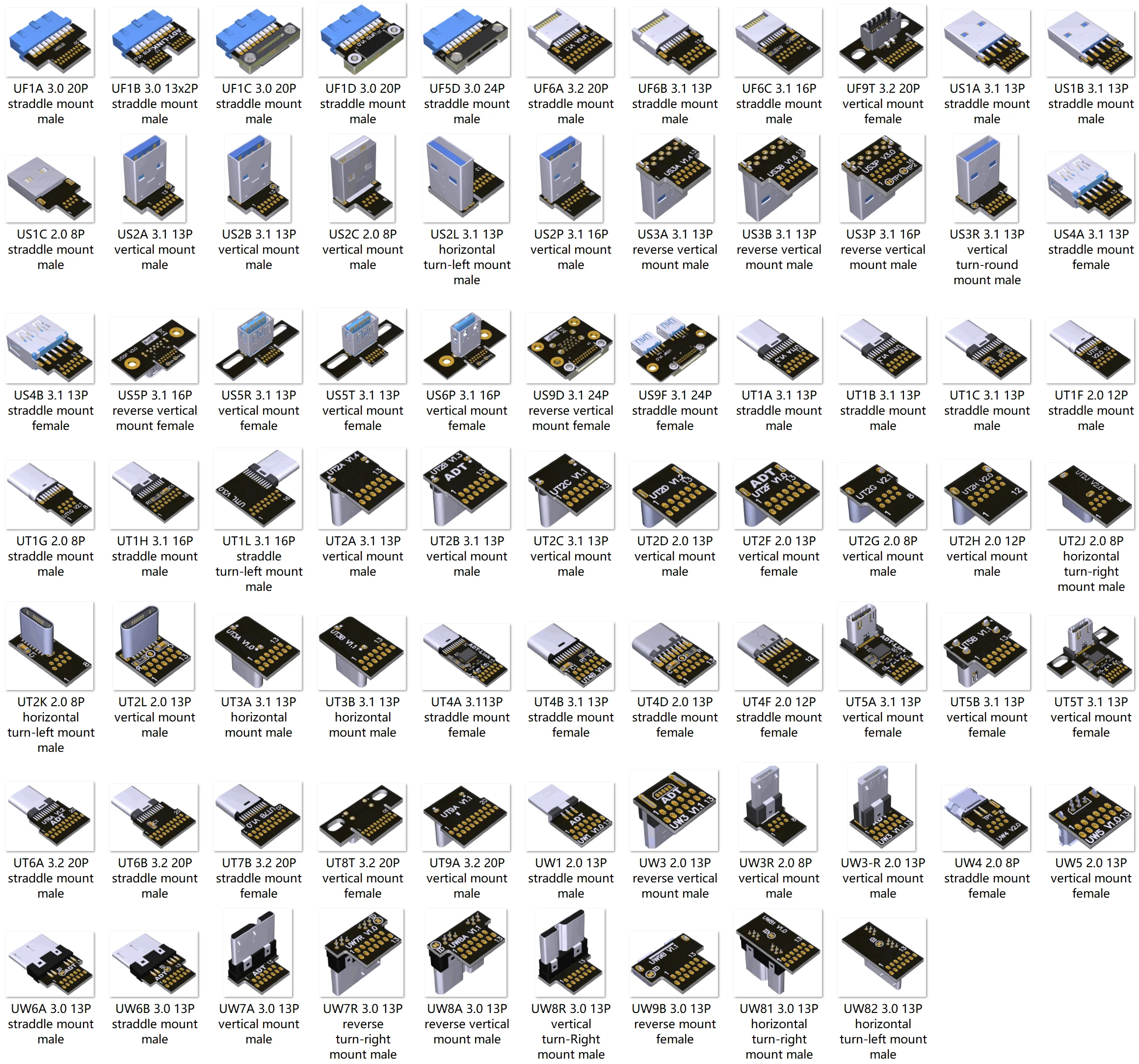 S = USB-A ; C = USB-C ; W = USB-B ; F = USB-E