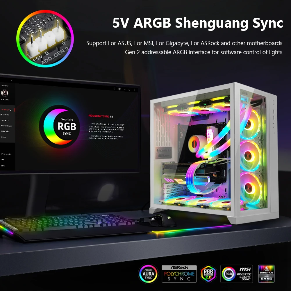 4. 5V ARGB и синхронизации:Программируемый 16,8 миллионов цветов, поддержка адресуемого ARGB интерфейса второго поколения для ASUS / MSI / Gigabyte / ASRock и других материнских плат и управление освещением через программное обеспечение.
