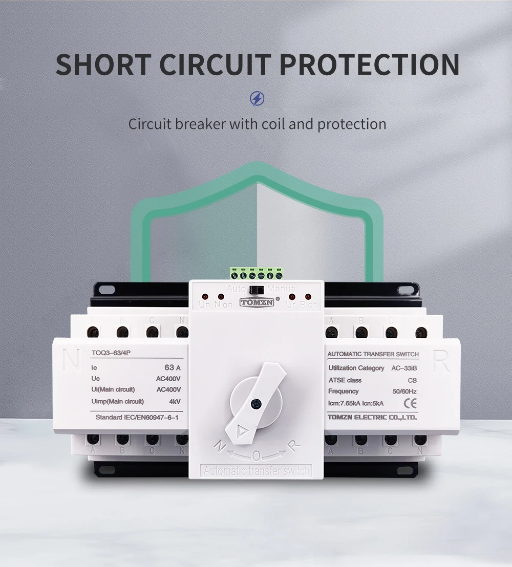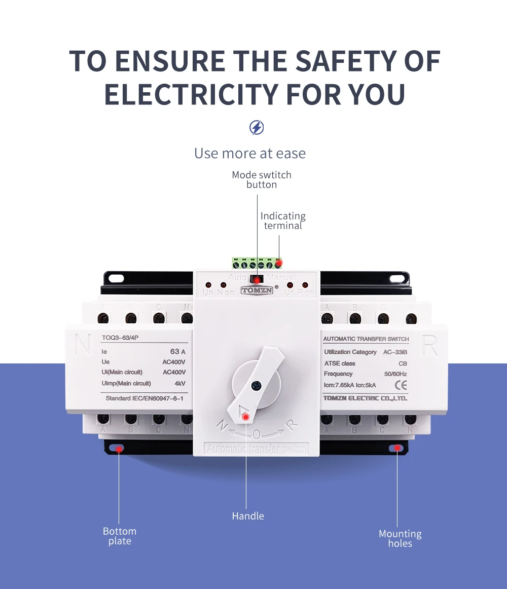 TOQ3D-это терминальное устройство автоматической передачи. Она подходит для 3 фазы 4 провода (или 1 Фаза 1 провод) с двумя электросети переменного тока в переменного тока, 50/60 Гц, номинальное напряжение 400V/230V и номинальный ток до 63A. Когда одна мощность идет неправильно (только проверьте нормальную фазу напряжения и резервную фазу напряжения A, только тест потери напряжения или фазы потери), он автоматически подключает один или несколько цепей нагрузки от одной мощности к другой мощности автоматически, чтобы обеспечить нормальный источник питания цепей нагрузки.